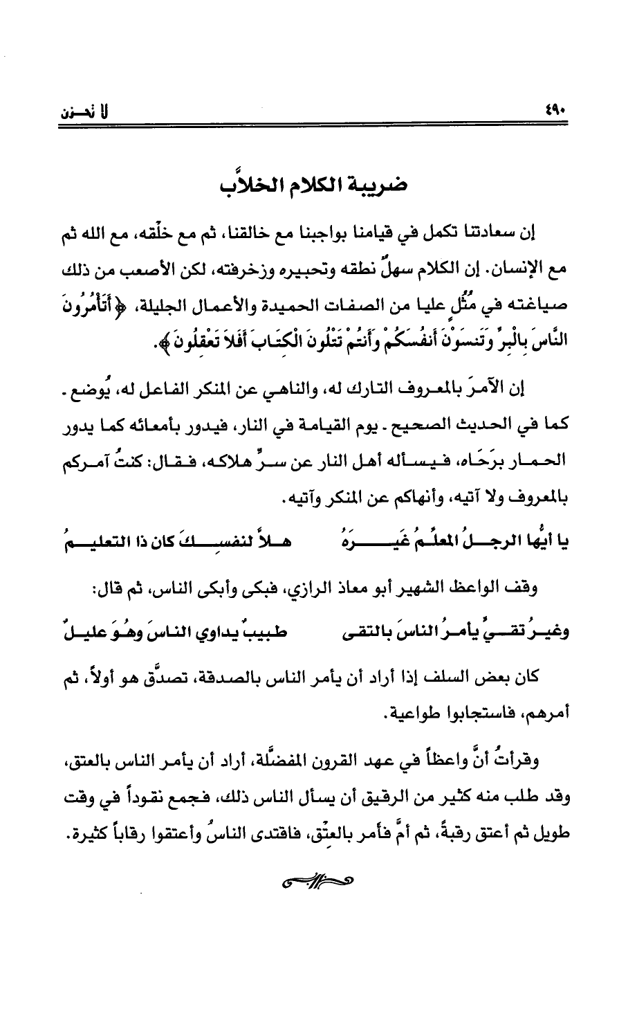 إنّ سعادتنا تكملُ في قيامِنا بواجبنا مع خالقِنا، ثم مع خلْقِه، مع اللهِ ثم مع الإنسانِ. إن الكلام سهلٌ نطقُه وتجبيرُه وزخرفتُه، لكن الأصعب من ذلك صياغتُه في مُثُلٍ عليا من الصفاتِ الحميدةِ والأعمالِ الجليلةِ {أَتَأْمُرُونَ النَّاسَ بِالْبِرِّ وَتَنسَوْنَ أَنفُسَكُمْ وَأَنتُمْ تَتْلُونَ الْكِتَابَ أَفَلاَ تَعْقِلُونَ} .
