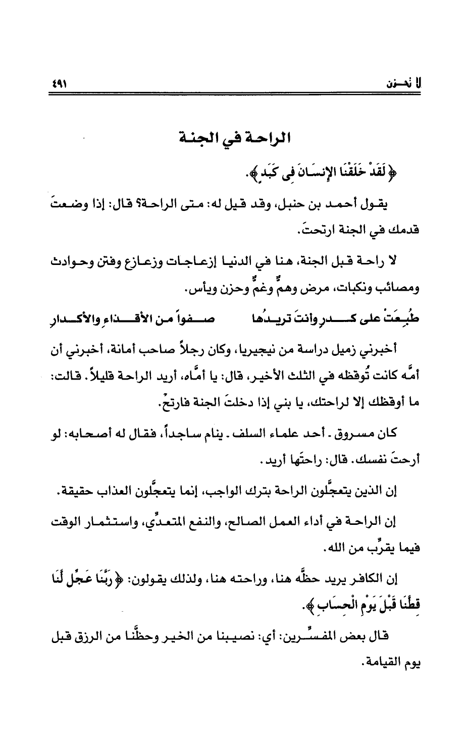 لا راحة قبل الجنةِ، هنا في الدنيا إزعاجاتُ وزعازعُ وفتنٌ وحوادثُ ومصائبُ ونكباتُ، مَرَضٌ وهمٌّ وغمُّ وحزنٌ ويأسٌ.