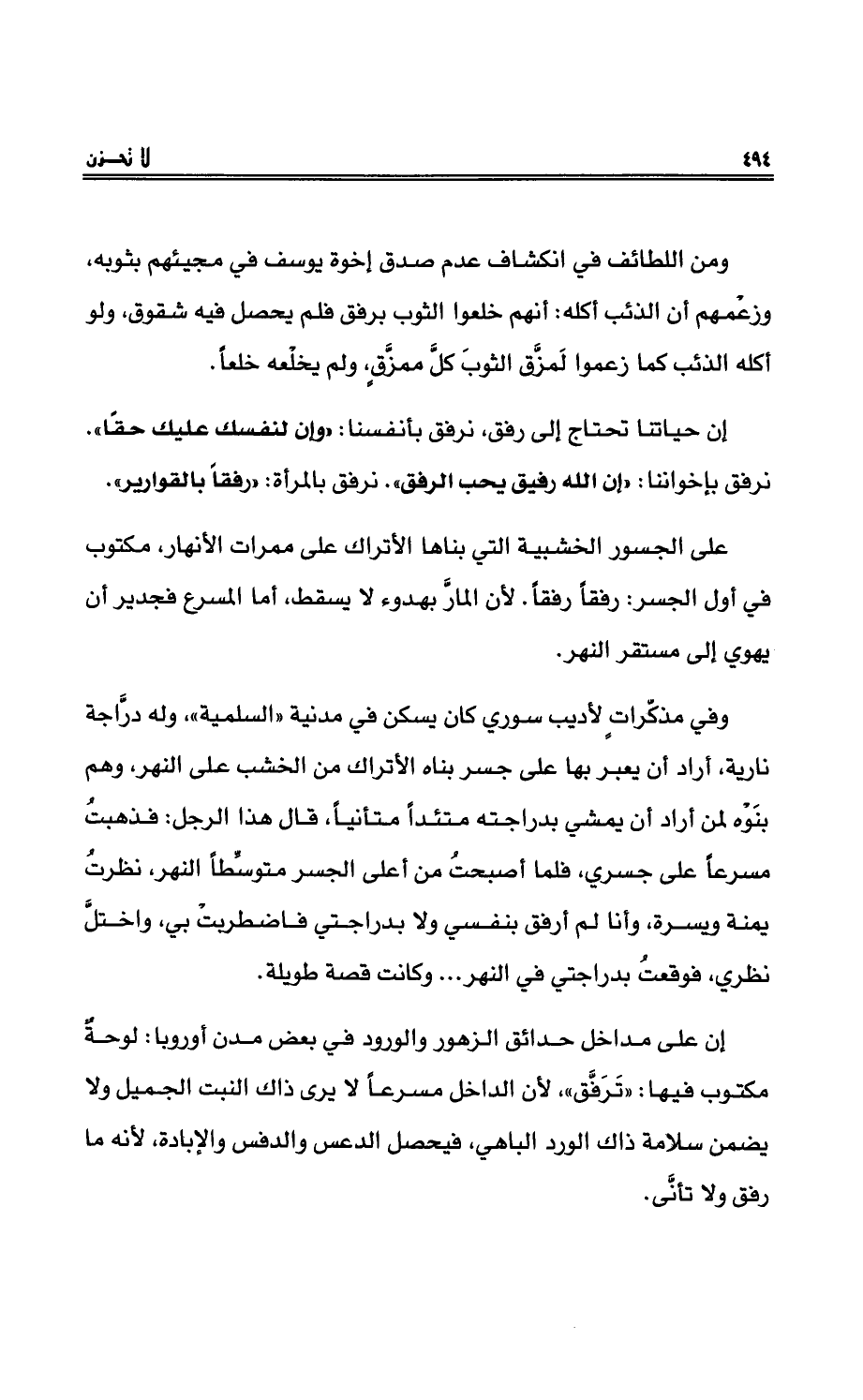 إنَّ على مداخلِ حدائقٍ الزهورِ والورود في بعضِ مدنِ أوروبة: لوحةٌ مكتوب فيها: «تَرَفَّقْ» ، لأن الداخل مسرعاً لا يرى ذاك النبت الجميل ولا يضمنُ سلامة ذاك الوردِ الباهي، فيحصل الدعس والدفس والإبادة، لأنه ما رفق ولا تأنَّى.