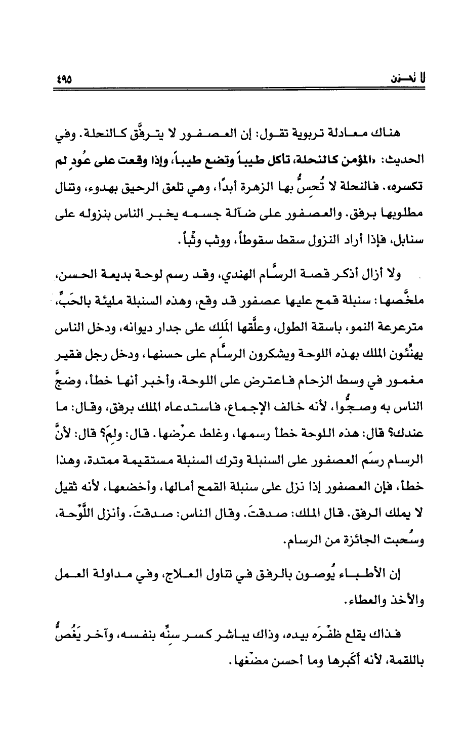 ولا أزالُ أذكرُ قصة الرسَّام الهنديِّ، وقد رسم لوحةً بديعة الحسنِ ملخَّصها: سنبلةُ قمح عليها عصفورٌ قد وقع، وهذه السنبلة مليئةٌ بالحبِّ، مترعرعةُ النموِّ، باسقةُ الطولِ، وعلَّقها الملِكُ على جدارِ ديوانِه، ودخل الناسُ يهنِّئون الملك بهذه اللوحةِ ويشكرون الرسَّام على حسنِها، ودخل رجلٌ فقيرٌ مغمورٌ في وسطِ الزحامِ فاعترض على اللوحةِ، وأخبرَ أنها خطٌأ، وضجَّ الناسُ به وصجُّوا، لأنه خالف الإجماع، فاستدعاه الملكُ برفقٍ وقال: ما عندك؟ قال: هذه اللوحةُ خطٌأ رسمُها، وَغَلطٌ عرْضها. قال: ولِمَ؟ قال: لأنَّ الرسام رسمَ العصفور على السنبلةِ وترك السنبلة مستقيمةً ممتدةً، وهذا خطٌأ، فإنِّ العصفور إذا نزل على سنبلة القمحِ أمالها، وأخضعها، لأنه ثقيلٌ لا يملكُ الرفق. قال الملكُ: صدقت. وقال الناسُ: صدقت. وأنزل اللَّوْحة، وسُحبت الجائزةُ من الرسامِ.