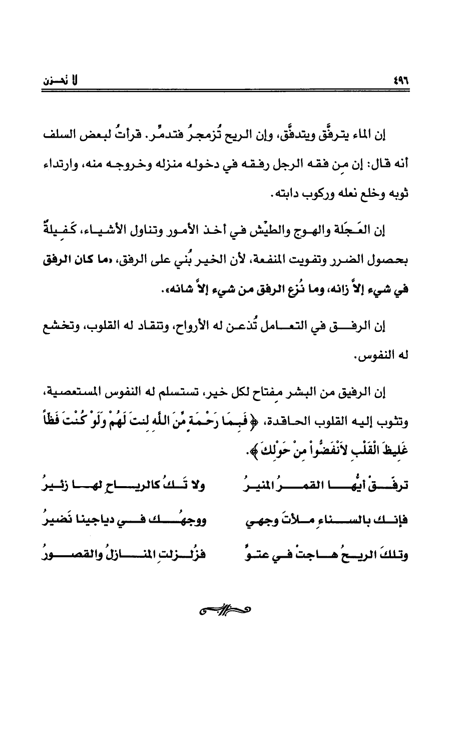 إن الماء يترفَّقُ، وإن الريح تُزمجرُ فتدمِّرُ. قرأتُ لبعضِ السلفِ أنه قال: إن مِن فِقْهِ الرجل رِفْقَهُ في دخولِه وخروجِه منه، وارتداءِ ثوبِه وخَلْعِ نعلِه وركوبِ دابتهِ.