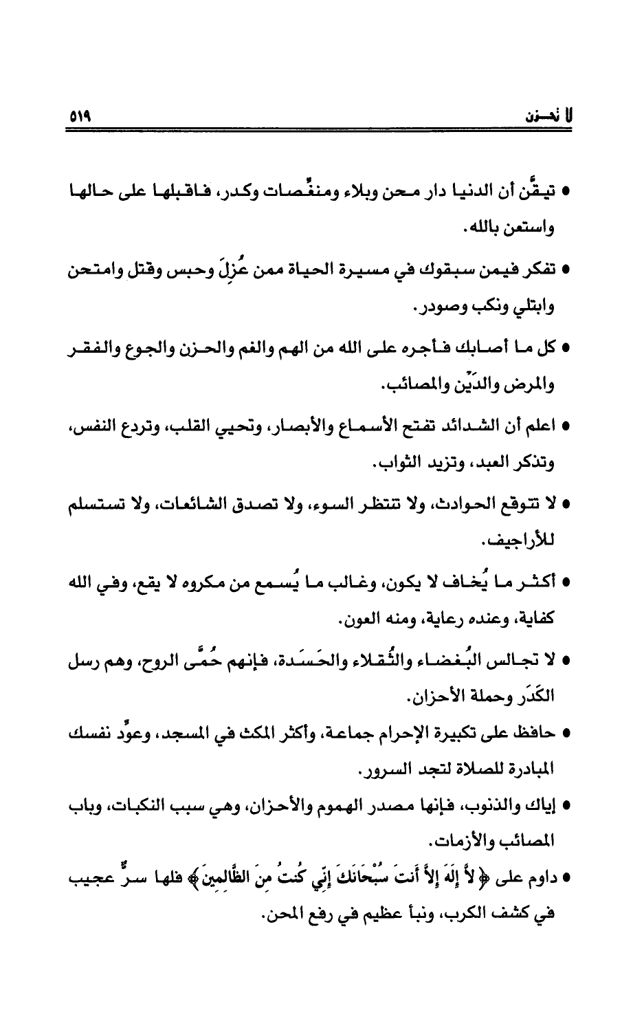 - داومْ على {لا إِلَهَ إِلاَّ أَنْتَ سُبْحَانَكَ إِنِّي كُنتُ مِنْ الظَّالِمِينَ} . فلها سرٌّ عجيبٌ في كشف الكْربِ , ونبأٌ عظيمٌ في رفعِ المحنِ.