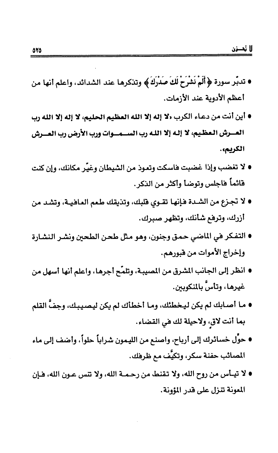 - تدبّرْ سورة {أَلَمْ نَشْرَحْ لَكَ صَدْرَكَ} وتذكرْها عند الشدائدِ، واعلمْ أنها من أعظمِ الأدويةِ عند الأزماتِ.