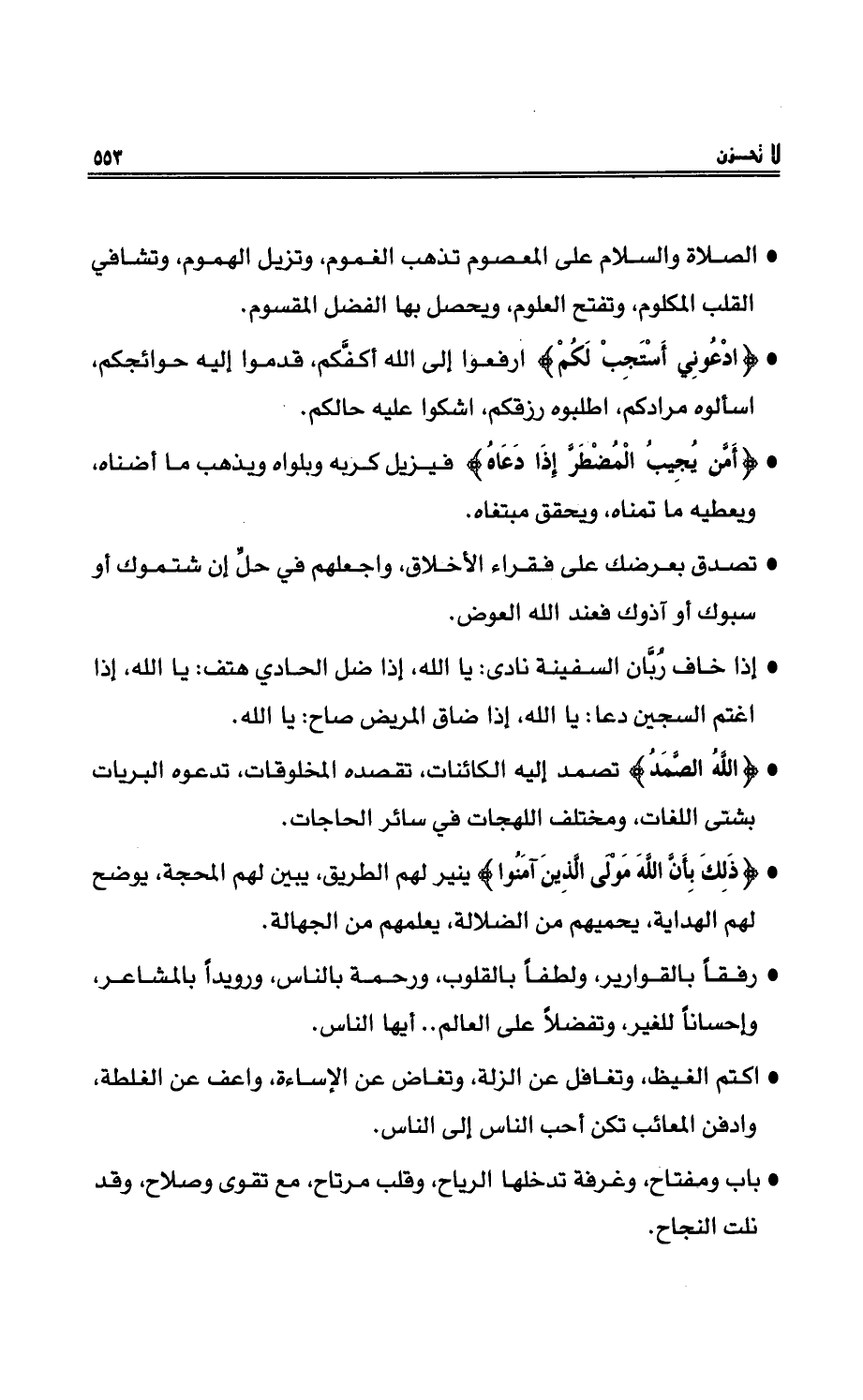 - الصلاةُ والسلامُ على المعصومِ تذهبُ الغمومُ، وتزيلُ الهمومُ , وتشافي القلب المكلوم، وتفتحُ العلوم ويحصل بها الفضلُ المقسومُ.