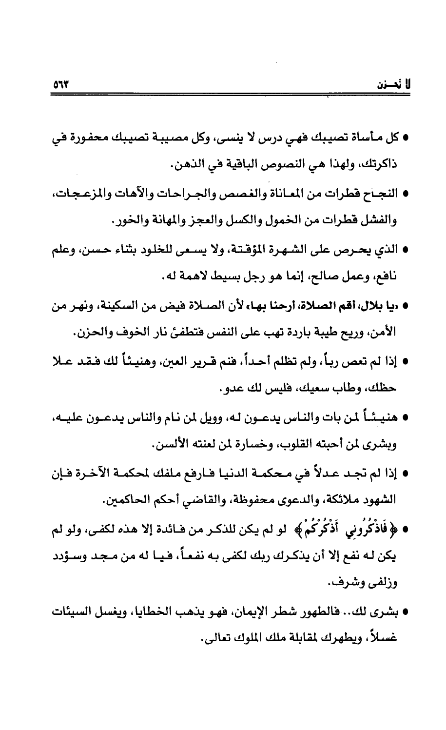 - ((يا بلال, أقمِ الصلاةَ , أرحْنا بها)) لأن الصلاة فيضٌ من السكينةِ , ونهرٌ من الأمنِ , وريحٌ طيبةٌ باردةٌ تهبُّ على النفسِ فتطفئَ نارَ الخوفِ والحزنِ.