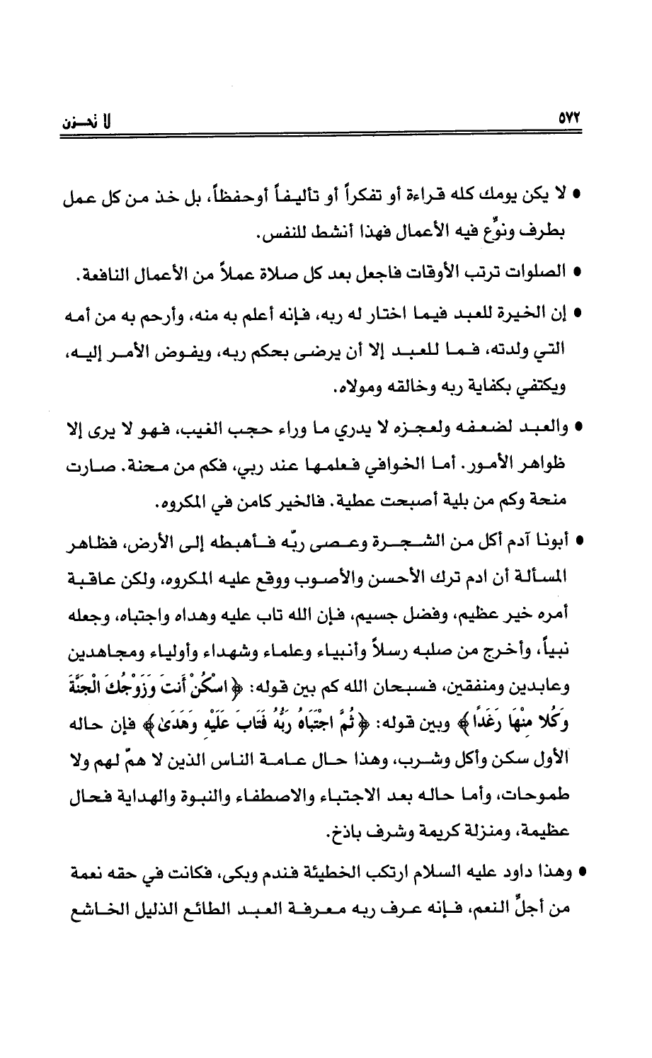 - لا يكن يومُك كلُّه قراءةً أو تفكراً أو تأليفاً أو حِفْظاً بل خذْ من كل عملٍ بطرفٍ ونوِّعْ فيه الأعمالَ فهذا أنشطُ للنفسِ.