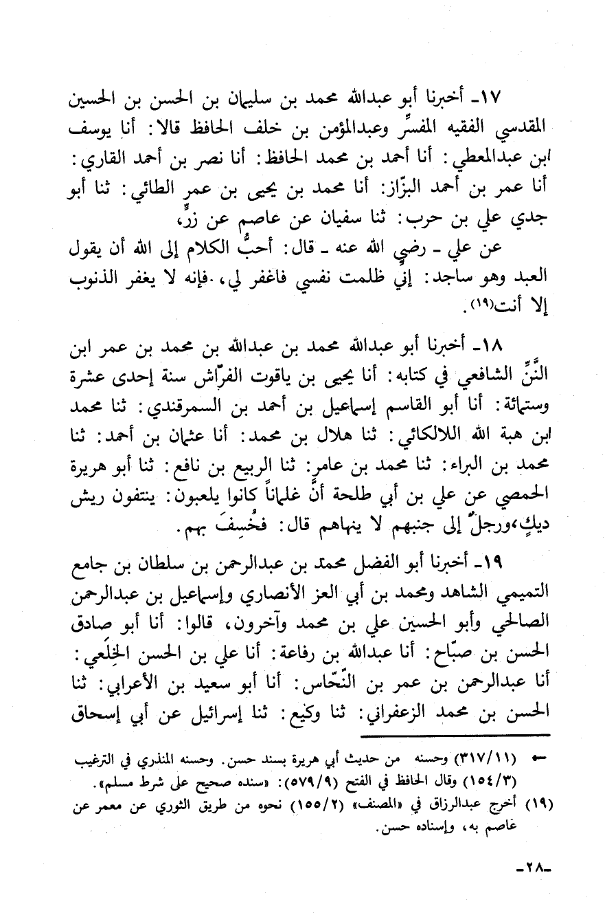 17 - أخبرنا أبو عبد الله محمد بن سليمان بن الحسن بن الحسين المقدسي الفقيه المفسر وعبد المؤمن بن خلف الحافظ قالا: أنا يوسف بن عب المعطي: أنا أحمد بن محمد الحافظ: أنا نصر بن أحمد القاري: أنا عمر بن أحمد البزاز: أنا محمد بن يحيى بن عمر الطائي: ثنا أبو جدي علي بن حرب: ثنا سفيان بن عاصم عن زر، عن علي رضي الله عنه قال: "أحب الكلام إلى الله أن يقول العبد وهو ساجد: إني ظلمت نفسي فأغفر لي، فإنه لا يغفر الذنوب إلا أنت".