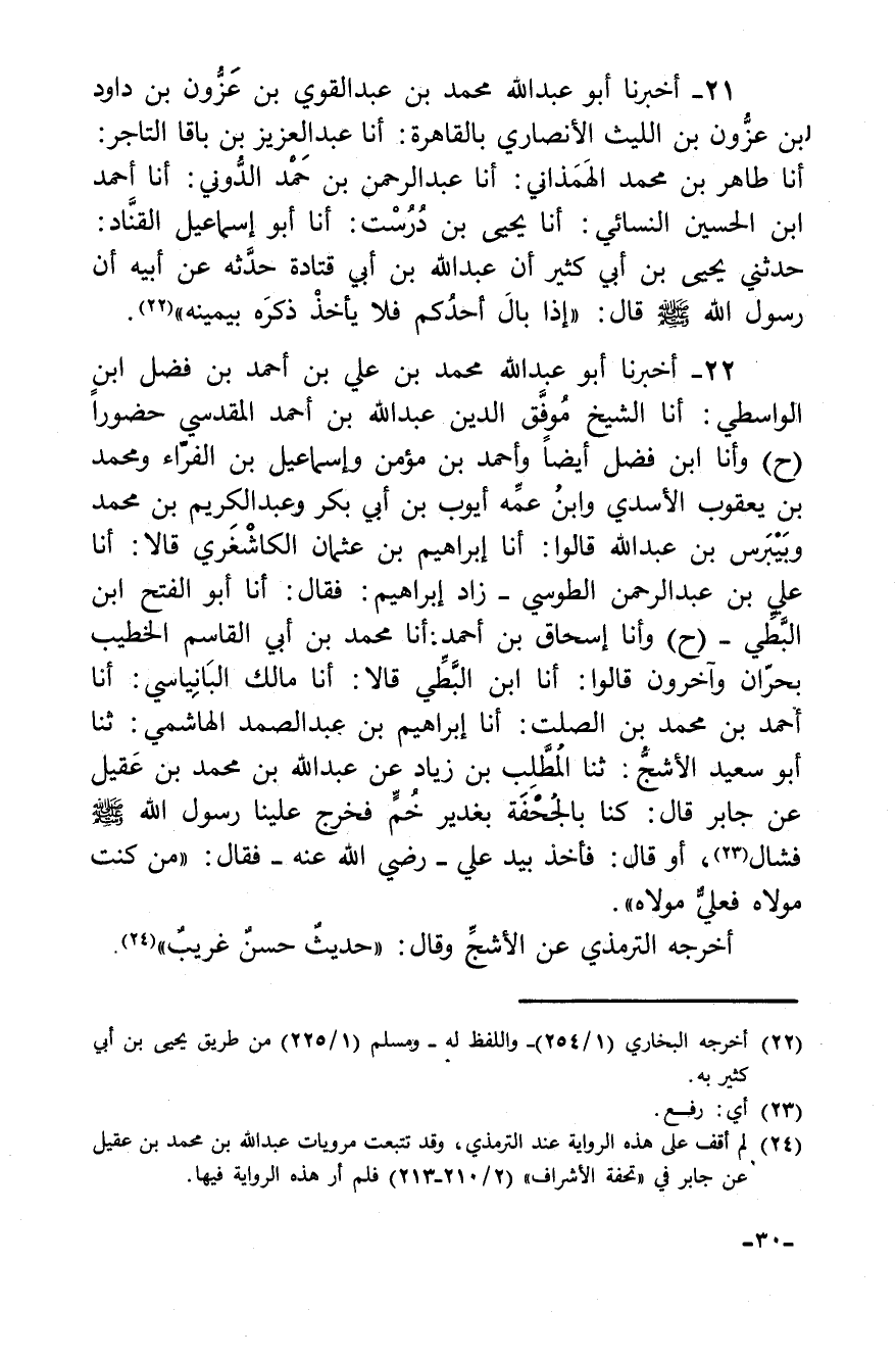 22 - أخبرنا أبو عبد الله محمد بن علي بن أحمد بن فضل بن الواسطي: أنا الشيخ موفق الدين عبد الله بن أحمد المقدسي حضورا (ح) وأنا ابن فضل أيضا وأحمد بن مؤمن وإسماعيل بن الفراء ومحمد بن يعقوب الأسدي وابن عمه أيوب بن أبي بكر وعبد الكريم بن محمد وبيبرس بن عبد الله قالوا: أنا إبراهيم بن عثمان الكاشغري قالا: أنا على بن عبد الرحمن الطوسي زاد إبراهيم: فقال: أنا أبو الفتح بن البطي (ح) وأنا إسحاق بن أحمد: أنا محمد بن أبي القاسم الخطيب بحران وآخرون قالوا: أنا ابن البطي قالا: أنا مالك البانياسي: أنا أحمد بن محمد بن الصلت: أنا إبراهيم بن عبد الصمد الهاشمي: ثنا أبو سعيد الأشج: ثنا المطلب بن زياد عن عبد الله بن محمد بن عقيل عن جابر قال: كنا بالجحفة بغدير خم فخرج علينا رسول الله صلى الله عليه وسلم فشال، أو قال: فأخذ بيد علي رضي الله عنه فقال: «من كنت مولاه فعلي مولاه».