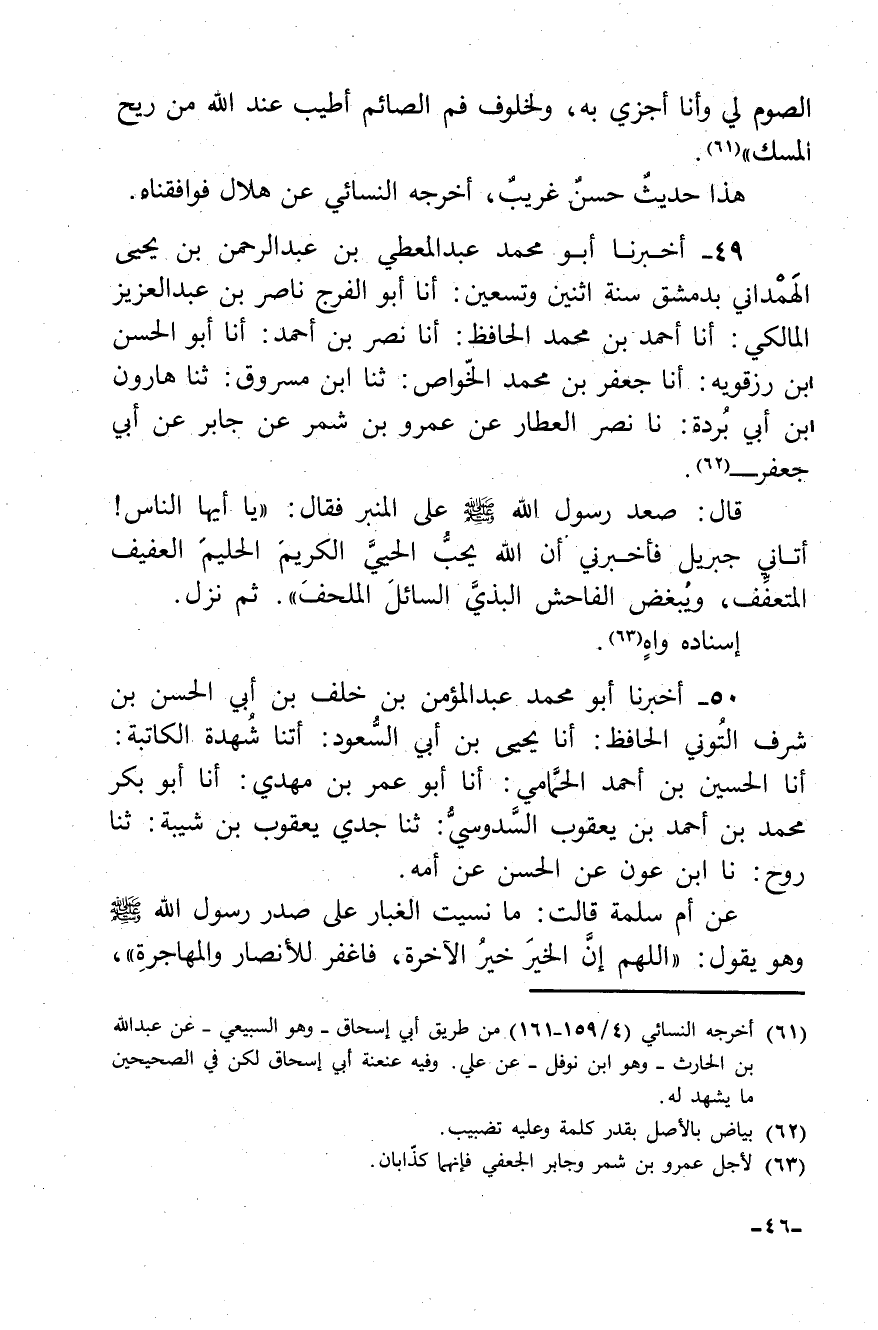 49 - أخبرنا أبو محمد عبد المعطي بن عبد الرحمن بن يحيى الهمداني بدمشق سنة اثنتين وتسعين: أنا أبو الفرج ناصر بن عبد العزيز المالكي: أنا أحمد بن محمد الحافظ: أنا نصر بن أحمد: أنا أبو الحسن بن رزقويه: أنا جعفر بن محمد الخواص: ثنا ابن مسروق: ثنا هارون بن أبي بردة: نا نصر العطار عن عمرو بن شمر عن جابر عن أبي جعفر: قال: صعد رسول الله صلى الله عليه وسلم على المنبر فقال: «يا أيها الناس! أتاني جبريل فأخبرني أن الله يحب الحيي الكريم الحليم العفيف المتعفف، ويبغض الفاحش البذي السائل الملحف»، ثم نزل.