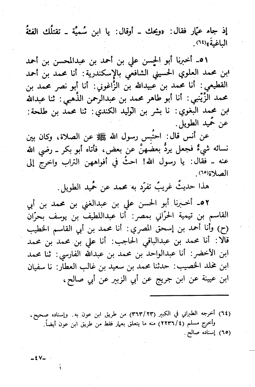 51 - أخبرنا أبو الحسن علي بن أحمد بن عبد المحسن بن أحمد بن محمد العلوي الحسيني الشافعي بالإسكندرية: أنا محمد بن أحمد القطيعي: أنا محمد بن عبيد الله الزاغوني: أنا أبو نصر محمد بن محمد الزينبي: أنا أبو طاهر محمد بن عبد الرحمن الذهبي: ثنا عبد الله بن محمد البغوي: أنا بشر بن الوليد الكندي: ثنا محمد بن طلحة: عن حميد الطويل، عن أنس قال: "احتبس رسول الله صلى الله عليه وسلم عن الصلاة، وكان بين نسائه شيء فجعل يرد بعضهن عن بعض، فأتاه أبو بكر رضي الله عنه فقال: يا رسول الله! احث في أفواههن التراب واخرج إلى الصلاة".