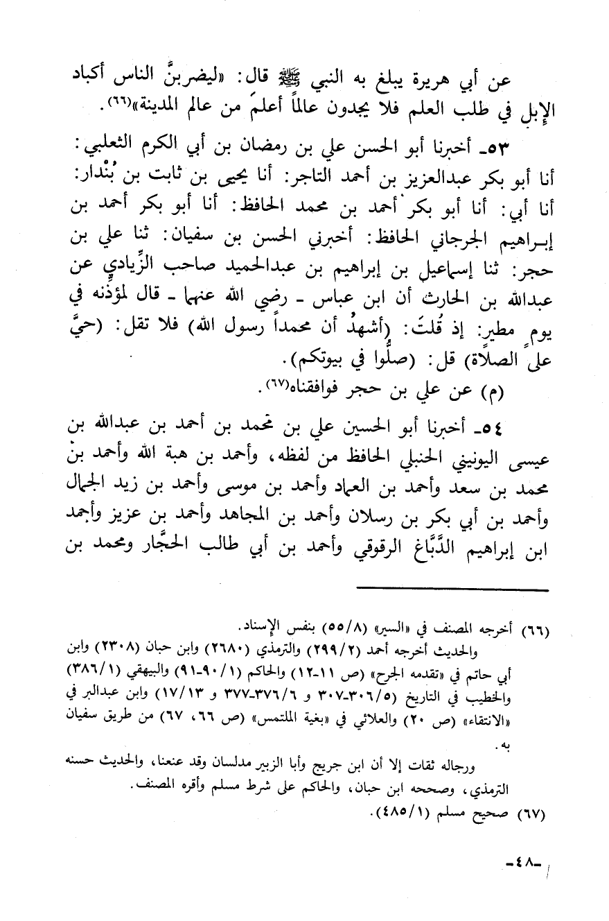 53 - أخبرنا أبو الحسن علي بن رمضان بن أبي الكرم الثعلبي: أنا أبو بكر عبد العزيز بن أحمد التاجر: أنا يحيى بن ثابت بن بندار: أنا أبي: أنا أبو بكر أحمد بن محمد الحافظ: أنا أبو بكر أحمد بن إبراهيم الجرجاني الحافظ: أخبرني الحسن بن سفيان: ثنا علي بن حجر: ثنا إسماعيل بن إبراهيم بن عبد الحميد صاحب الزيادي عن عبد الله بن الحارث أن ابن عباس رضي الله عنهما قال لمؤذنه في يوم مطير: "إذا قلت: (أشهد أن محمدا رسول الله) فلا تقل: (حي على الصلاة) قل: (صلوا في بيوتكم) ".