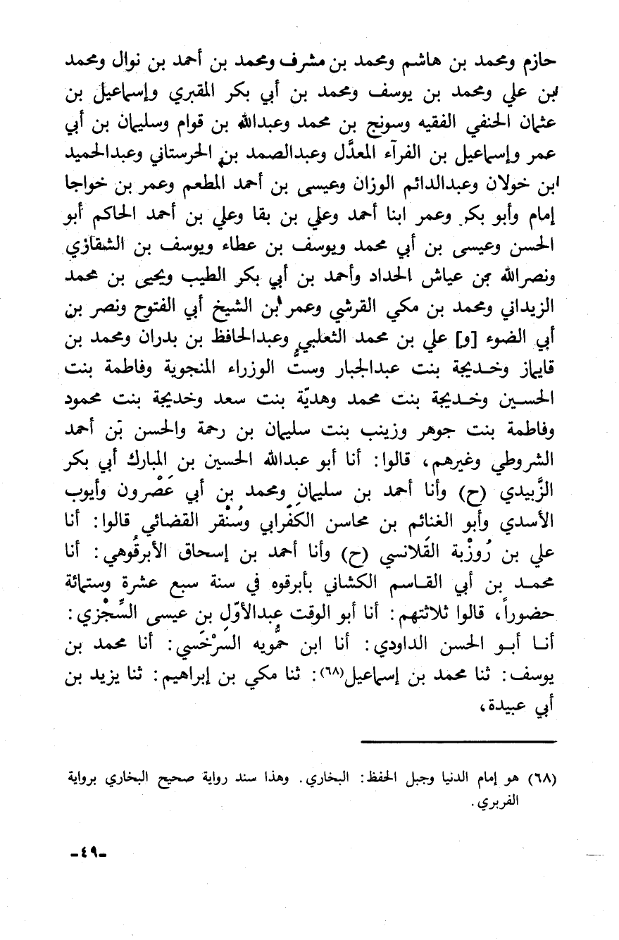 حازم ومحمد بن هاشم ومحمد بن مشرف ومحمد بن أحمد بن نوال ومحمد بن علي ومحمد بن يوسف ومحمد بن أبي بكر المقبري وإسماعيل بن عثمان الحنفي الفقيه وسونج بن محمد وعبد الله بن قوام وسليمان بن أبي عمر وإسماعيل بن الفراء المعدل وعبد الصمد بن الحرستاني وعبد الحميد بن خولان وعبد الدائم الوزان وعيسى بن أحمد المطعم وعمر بن خواجا إمام وأبو بكر وعمر ابنا أحمد وعلي بن بقا وعلي بن أحمد الحاكم أبو الحسن وعيسى بن أبي محمد ويوسف بن عطاء ويوسف بن الشقاري ونصر الله بن عياش الحداد وأحمد بن أبي بكر الطيب ويحيى بن محمد الزيداني ومحمد بن مكي القرشي وعمر بن الشيخ أبي الفتوح ونصر بن أبي الضوء وعلي بن محمد الثعلبي وعبد الحافظ بن بدران ومحمد بن قايماز وخديجة بنت عبد الجبار وست الوزراء المنجوية وفاطمة بنت الحسين وخديجة بنت محمد وهدية بنت سعد وخديجة بنت محمود وفاطمة بنت جوهر وزينب بنت سليمان بن رحمة والحسن بن أحمد الشروطي وغيرهم، قالوا: أنا أبو عبد الله الحسين بن المبارك أبي بكر الزبيدي (ح) وأنا أحمد بن سليمان ومحمد بن أبي عصرون وأيوب الأسدي وأبو الغنائم بن محاسن الكفرابي وسنقر القضائي قالوا: أنا علي بن روزبة القلانسي (ح) وأنا أحمد بن إسحاق الأبرقوهي: أنا محمد بن القاسم الكشاني بأبرقوه في سنة سبع عشرة وستمائة، حضورا، قالوا ثلاثتهم: أنا أبو الوقت عبد الأول بن عيسى السجزي: أنا أبو الحسن الداودي:! ابن حموية السرخسي: أنا محمد بن يوسف: ثنا محمد بن إسماعيل: ثنا مكي بن إبراهيم: ثنا يزيد بن أبي عبيدة