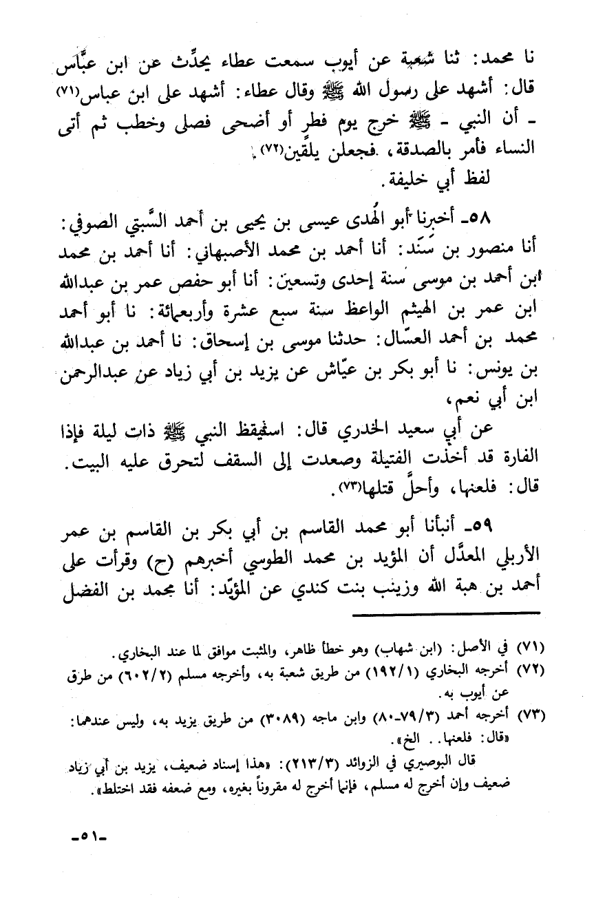 58 - أخبرنا أبو الهدى عيسى بن يحيى بن أحمد السبتي الصوفي: أنا منصور بن سند: أنا أحمد بن محمد الأصبهاني: أنا أحمد بن محمد بن أحمد بن موسى سنة إحدى وتسعين: أنا أبو حفص عمر بن عبد الله بن عمر بن الهيثم الواعظ سنة سبع عشرة وأربعمائة: نا أبو أحمد محمد بن أحمد العسال: حدثنا موسى بن إسحاق: نا أحمد بن عبد الله بن يونس: نا أبو بكر بن عياش عن يزيد بن أبي زياد عن عبد الرحمن ابن أبي نعم، عن أبي سعيد الخدري قال: "استيقظ النبي صلى الله عليه وسلم ذات ليلة فإذا الفارة قد أخذت الفتيلة وصعدت إلى السقف لتحرق عليه البيت، قال: فلعنها، وأحل قتلها".