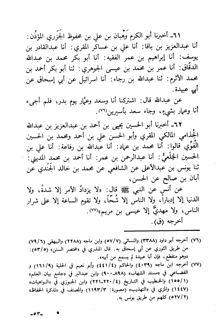 61 - أخبرنا أبو المكارم وهبان بن علي بن محفوظ الجزري المؤذن: أنا عبد العزيز بن باقا: أنا علي بن عساكر المقري: أنا عبد القادر بن يوسف: أنا إبراهيم بن عمر الفقيه: أنا أبو بكر محمد بن عبد الله الدقاق: أنا عمر بن محمد بن عيسى الجوهري: ثنا أبو بكر أحمد بن محمد الأثرم: ثنا عبد الله بن رجاء: أنا إسرائيل عن أبي إسحاق عن أبي عبيدة، عن عبد الله قال: "اشتركنا أنا وسعد وعمار يوم بدر، فلم أجيء أنا وعمار بشيء، وجاء سعد بأسيرين".