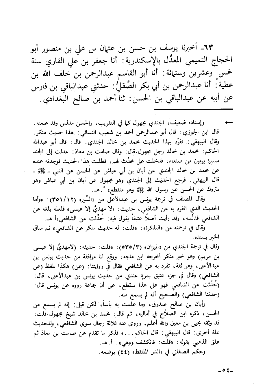 63 - أخبرنا يوسف بن حسن بن عثمان بن علي بن منصور أبو الحجاج التميمي المعدل بالإسكندرية: أنا جعفر بن علي القارئ سنة خمس وعشرين وستمائة: أنا أبو القاسم عبد الرحمن بن خلف الله بن عطية: أنا عبد الرحمن بن أبي بكر الصقلي: حدثني عبد الباقي بن فارس عن أبيه عن عبد الباقي بن الحسن: ثنا أحمد بن صالح البغدادي