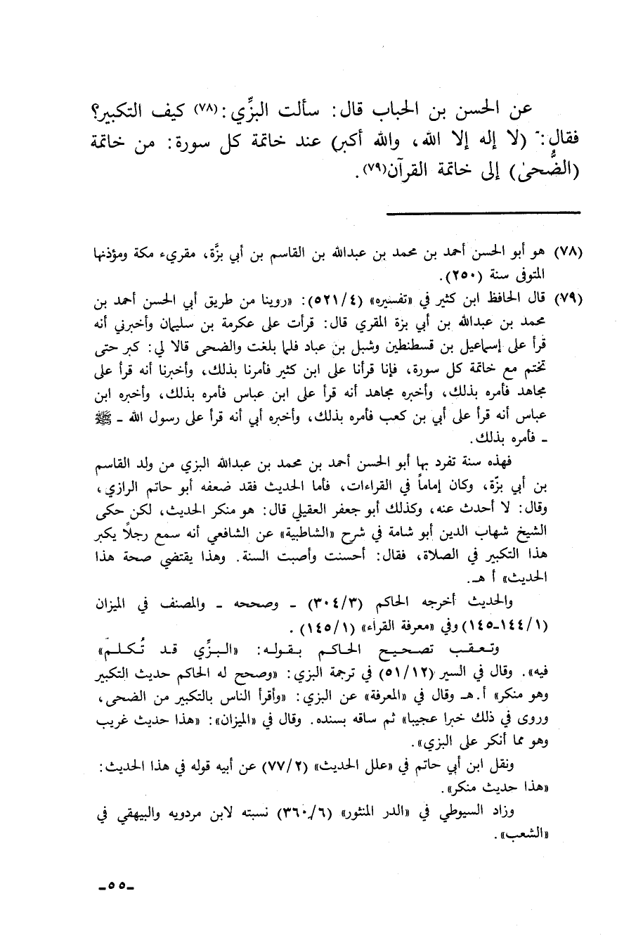 عن الحسن بن الحباب قال: "سألت البزي كيف التكبير؟ فقال: (لا إله إلا الله، والله أكبر) عند خاتمة كل سورة: من خاتمة (الضحى) إلى خاتمة القرآن".