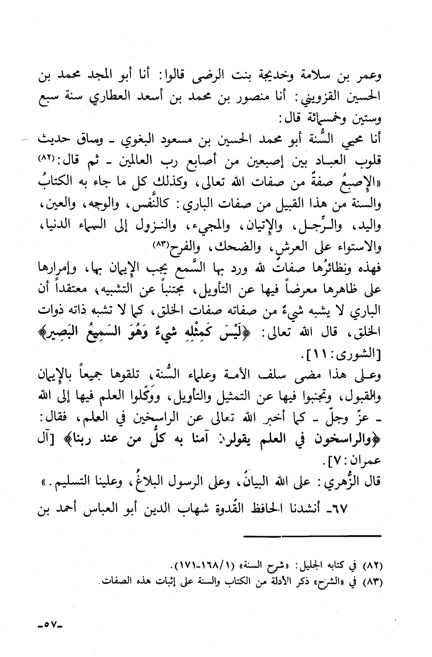 وعمر بن سلامة وخديجة بنت الرضى قالوا: أنا أبو المجد محمد بن الحسين القزويني: أنا منصور بن محمد بن أسعد العطاري سنة سبع وستين وخمسمائة قال: أنا محيي السنة أبو محمد الحسين بن مسعود البغوي وساق حديث قلوب العباد بين إصبعين من أصابع رب العالمين ثم قال: " الأصبع صفة من صفات الله تعالى، وكذلك كل ما جاء به الكتاب والسنة من هذا القبيل من صفات الباري: كالنفس، والوجه، والعين، واليد، والرجل، والإتيان، والمجيء، والنزول إلى السماء الدنيا، والاستواء على العرش، والضحك، والفرح فهذه ونظائرها صفات لله ورد بها السمع يجب الإيمان بها، وإمرارها على ظاهرها معرضا فيها عن التأويل، مجتنبا عن التشبيه، معتقدا أن الباري لا يشبه شيء من صفاته صفات الخلق، كما لا تشبه ذاته ذوات الخلق، قال الله تعالى: {لَيْسَ كَمِثْلِهِ شَيْءٌ وَهُوَ السَّمِيعُ الْبَصِيرُ} [الشورى: 11].