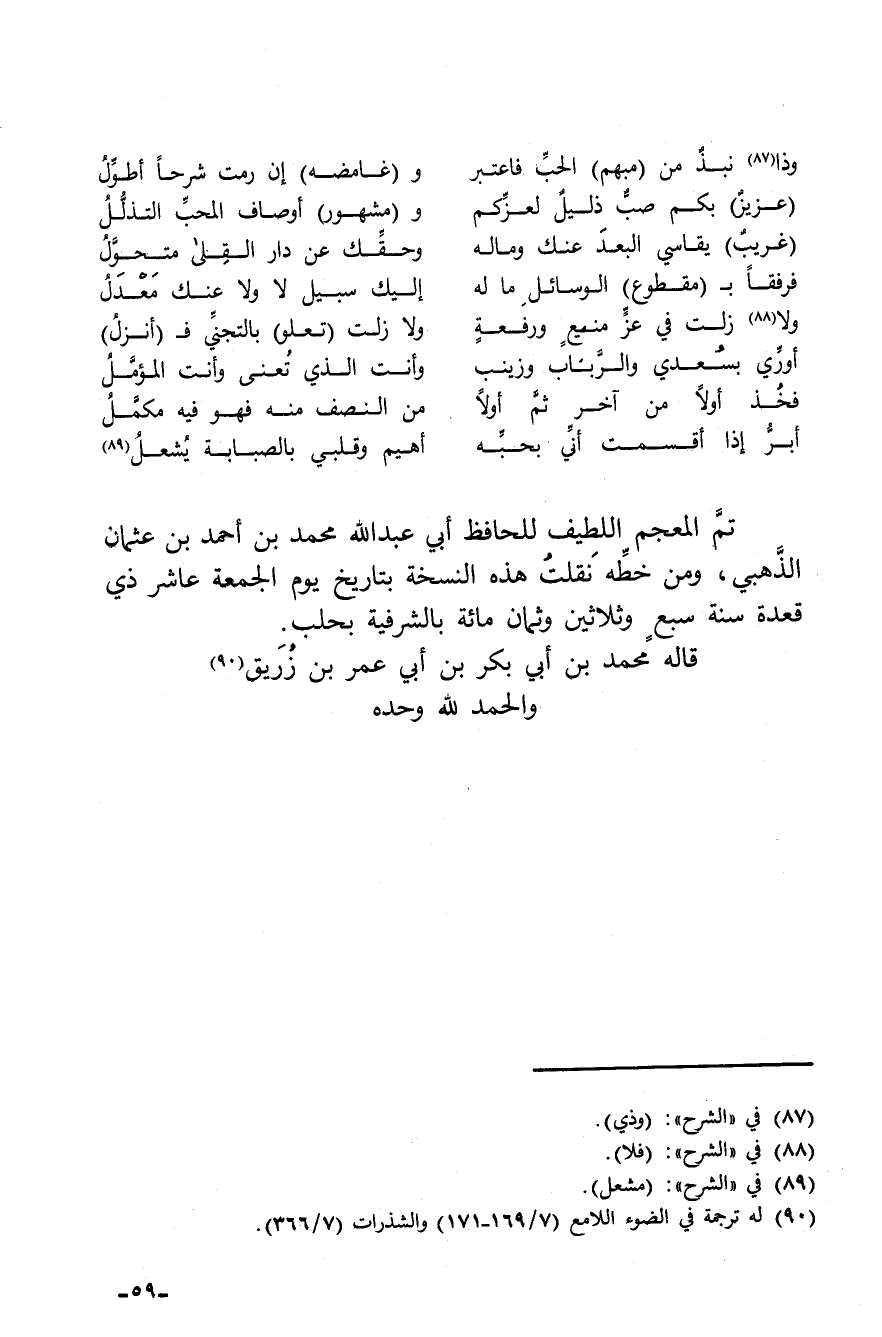 تم المعجم اللطيف للحافظ أبي عبد الله محمد بن أحمد بن عثمان الذهبي، ومن خطه نقلت هذه النسخة بتاريخ يوم الجمعة عاشر ذي قعدة سنة سبع وثلاثين وثمانمائة بالشرفية بحلب.