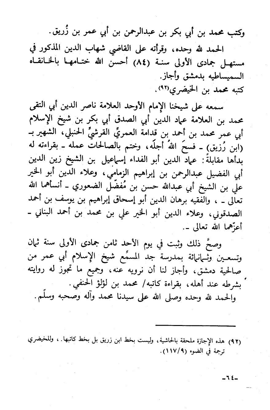 وصح ذلك وثبت في يوم الأحد ثامن جمادى الأولى سنة ثمان وتسعين وثمانمائة بمدرسة جد المسمع شيخ الإسلام أبي عمر، من صالحية دمشق، وأجاز لنا أن نرويه عنه، وجميع ما تجوز له روايته بشرطه عند أهله، بقراءة كاتبه/ محمد بن لؤلؤ الحنفي.