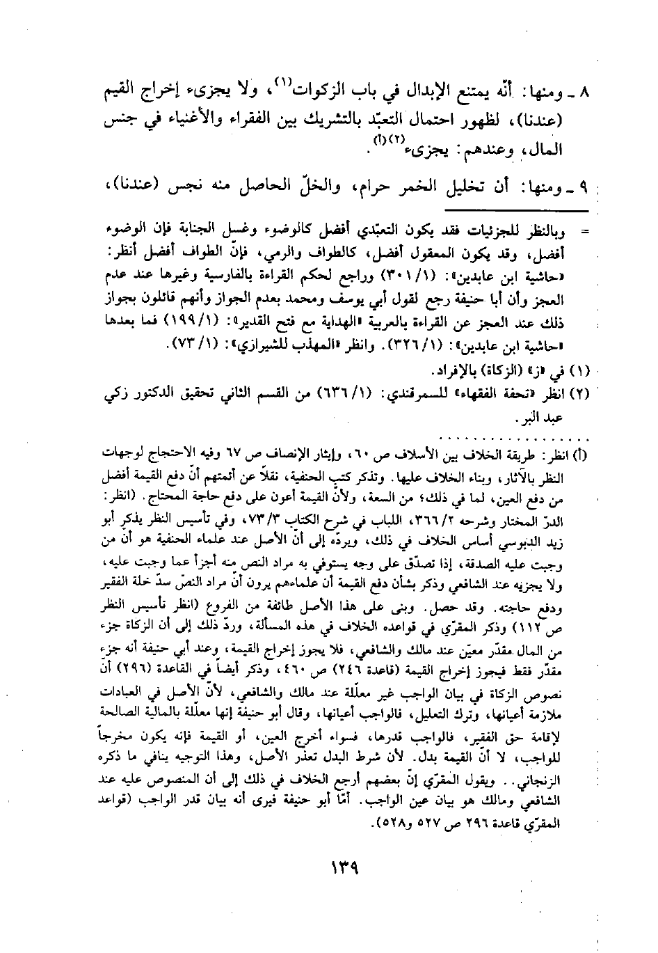 (أ) انظر: طريقة الخلاف بين الأسلاف ص ٦٠، وإيثار الإنصاف ص ٦٧ وفيه الاحتجاج لوجهات النظر بالآثار، وبناء الخلاف عليها. وتذكر كتب الحنفية، نقلاً عن أئمتهم أن دفع القيمة أفضل مندفع العين، لما في ذلك؛ من السعة، ولأن القيمة أعون على دفع حاجة المحتاج. (انظر: الدر المختار وشرحه ٢/ ٣٦٦، اللباب في شرح الكتاب ٣/ ٧٣، وفي تأسيس النظر يذكر أبو زيد الدبوسي أساس الخلاف في ذلك، ويرده إلى أن الأصل عند علماء الحنفية هو أن من وجبت عليه الصدقة، إذا تصدق على وجه يستوفي به مراد النص منه أجزأ عما وجبت عليه، ولا يجزيه عند الشافعي وذكر بشأن دفع القيمة أن علماءهم يرون أن مراد النص سد خلة الفقير ودفع حاجته. وقد حصل، وبنى على هذا الأصل طائفة من الفروع (انظر تأسيس النظر ص ١١٢) وذكر المقري في قواعده الخلاف في هذه المسألة، ورد ذلك إلى أن الزكاة جزء من لمال مقدر معين ند مالك والشافعي، فلايجوز إخراج القيمة، وعند أبي حنيفة أنه جزء مقدر فقط فيجوز إخراج القيمة (قاعدة ٢٤٦) ص ٤٦٠، وذكر أيضاً في القاعدة (٢٩٦) أن نصوص الزكاة في بيان الواجب غير معللة عند مالك والشافعي، لأن الأصل في العبادات ملازمة أعيانها، وترك التعليل، فالواجب أعيانها، وقال أبو حنيفة إنها معللة بالمالية الصالحة لإقامة حق الفقير، فالواجب قدرها، فسواء أخرج العين، أو القيمة فإنه يكون مخرجاً للواجب، لأن القيمة بدل. لأن شرط البدل تعذر الأصل، وهذا التوجيه ينافي ما ذكره الزنجاني .. ويقول المقري إن بعضهم أرجع الخلاف في ذلك إلى أن المنصوص عليه عند الشافعي ومالك هو بيان عين الواجب. أما أبو حنيفة فيرى أنه بيان قدر الواجب (قواعد المقري قاعدة ٢٩٦ ص ٤٢٧ و٥٢٨).