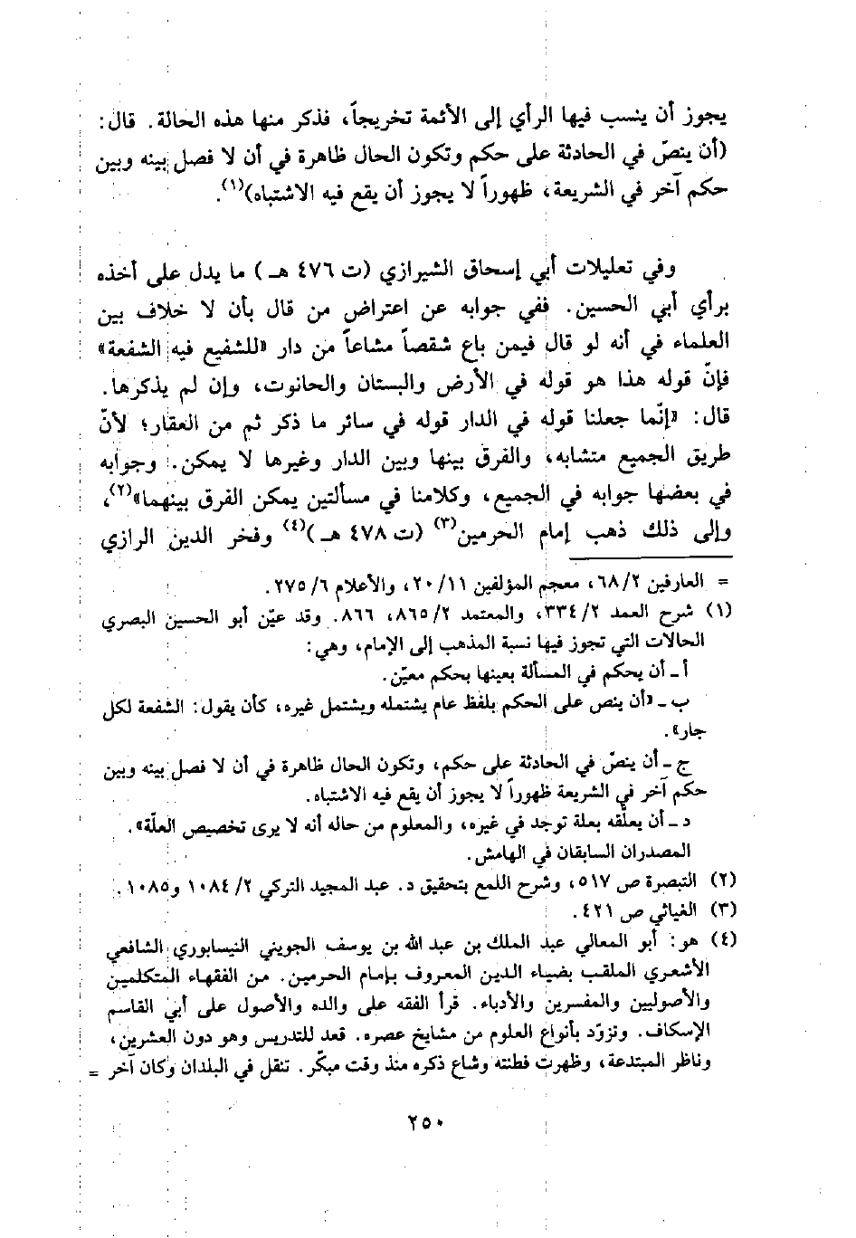 وفي تعليلات أبي إسحاق الشيرازي (ت ٤٧٦هـ) ما يدل على أخذه برأ] أبي الحسين. ففي جوابه عن اعتراض من قال بأن لا خلاف بين العلماء في أنه لو قال فيمن باع شقصاً مشاعاً من دار "للشفيع فيه الشفعة" فإن قوله هذا هو قوله في الأرض والبستان والحانوت، وإن لم يذكرها. قال: "إنما جعلنا قوله في الدار قوله في سائر ما ذكر ثم من العقار؛ لأن طريق الجميع متشابه، والفرق بينها وبين الدار وغيرها لا يمكن. وجوابه في بعضها جوابه في الجميع، وكلامنا في مسألتين يمكن الفرق بينهما (٢) "، وإلى ذلك ذهب إمام الحرمين (٣) (ت ٤٧٨هـ) (٤) وفخر الدين الرازي