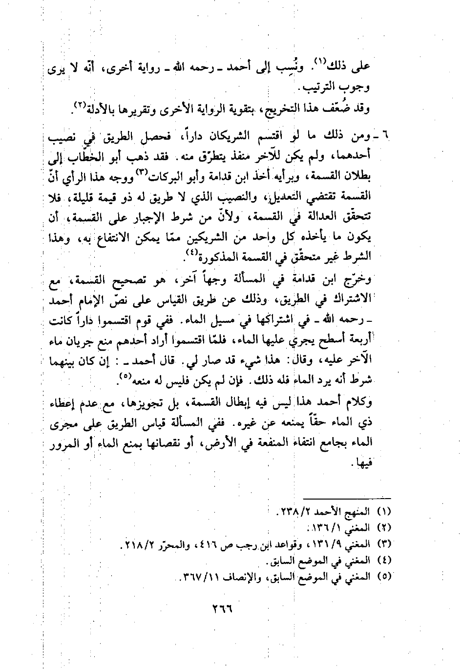 وكلام أحمد هذا ليس فيه إبطال القسمة، بل تجويزها، مع عدم إعطاء ذي الماء حقاً يمنعه عن غيره. ففي المسألة قياس الطريق على مجرى الماء بجامع انتفاء المنفعة في الأرض، أو نقصانها بمنع الماء أو المرور فيها.