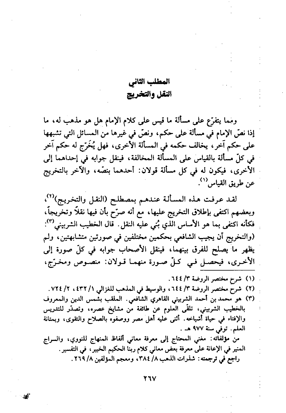 لقد عرفت هذه المسألة عندهم بمصطلح (النقل والتخريج) (٢)، وبعضهم اكتفى بإطلاق التخريج عليها، مع أنه صرح بأن فيها نقلاً وتخريجاً، فكأنه اكتفى بما هو الأساس الذي بني عليه النقل. قال الخطيب الشربيني (٣): (والتخريج أن يجيب الشافعي بحكمين مختلفين في صورتين متشابهتين، ولم يظهر ما يصلح للفرق بينهما، فينقل الأصحاب جوابه في كل صورة إلى الأخرى، فيحصل في كل صورة منهما قولان: منصوص ومخرج،