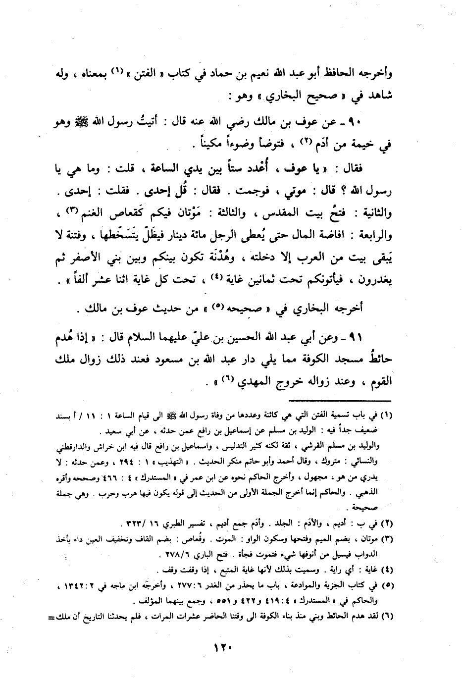 فوجمت، فقال: " قل إِحُدَى " فقلت: إِحُدَى " والثانية فتح بيت المقدس، والثالثة موتان فيكم كقعاص الغنم، والرابعة إفاضة المال حتى يعطى الرجل مائة دينار فيظل يتسخطها، وفتنة لا يبقى بيت من العرب إلا دخلته وهدنة تكون بينكم وبين بني الأصفر، ثم يغدرون فيأتونكم تحت ثمانين راية، كل راية اثنا عشر ألفاً ".