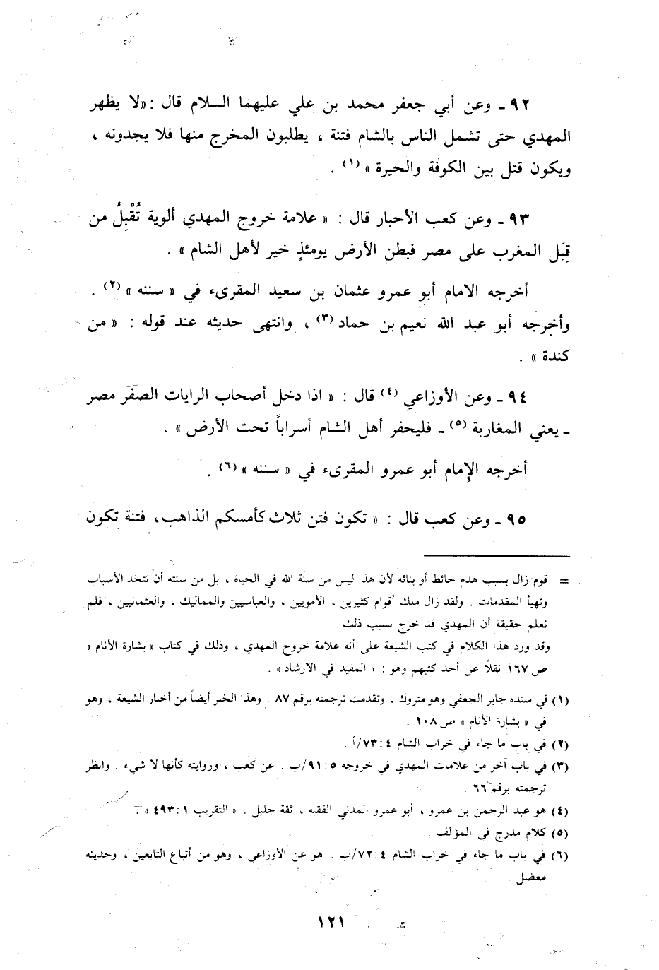 وعن كعب الأخبار، رضي الله عنه قال: علامة خروج المهدي ألوية تقبل من قبل المغرب، عليها رجل من كندة أعرج، فإذا ظهر أهل المغرب على مصر فبطن الأرض يومئذ خير لأهل الشام.