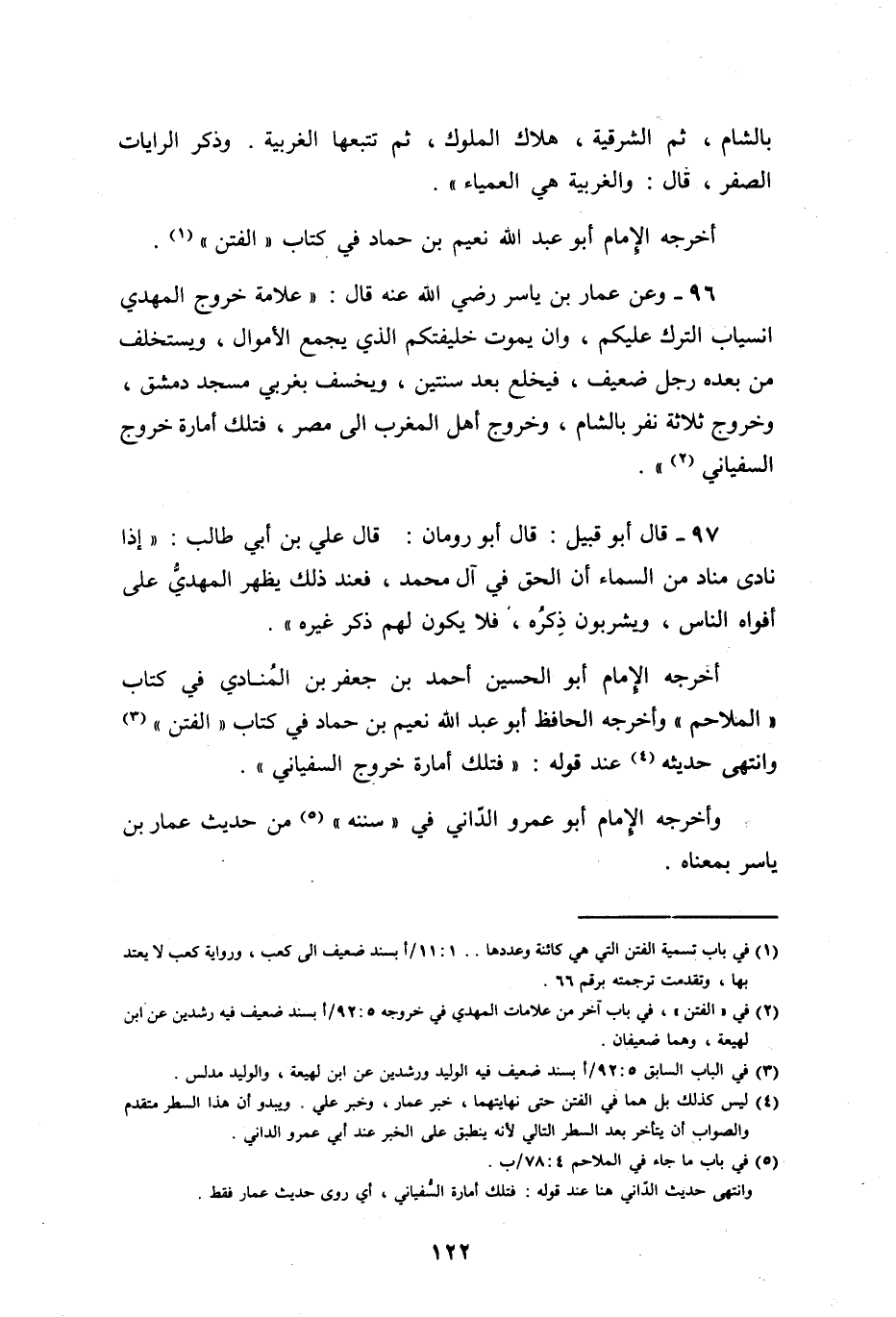 وعن عمار بن ياسر رضي الله عنه قال: علامة خروج المهدي انسياب الترك عليكم، وأن يموت خليفتكم الذي يجمع الأموال، ويستخلف من بعده، رجلاً ضعيفاً، فيخلع بعد سنتين ويخسف بغربي مسجد دمشق، وخروج ثلاثة نصر بالشام، وخروج هل المغرب إلى مضر، وتلك أمارة خروج السفياني.
