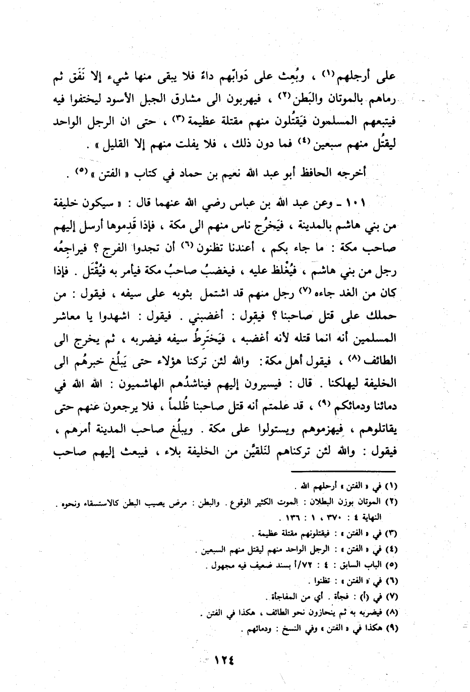 وعن عبد الله بن عباس رضي الله عنهما قال: سيكون خليفة من بني هاشم بالمدينة، فيخرج ناس منهم إلى مكة، فإذا قدموها أرسل إليهم صاحب مكة: ما جاء بكم، أعندنا تظنون أن تجدوا الفرج؟؟! فيراجعه رجل من بني هاشم فيغلظ عليه، فيغضب صاحب مكة، فيؤمر به فيقتل.