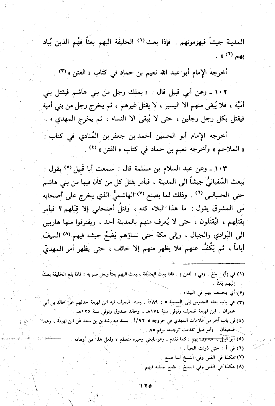 وعن عبد السلام بن مسلمة، قال: سمعت أبا قبيل، يقول: يبعث السفياني جيشاً إلى المدينة، فيأمر بقتل كل من كان فيها من بني هاشم حتى الحبالى، وذلك، لما صنع الهاشمي الذي يخرج على أصحابه من الشرق. يقول: ما هذا البلاء كله!! وقتل أصحابي غلا من قتلهم. فيأمر بقتلهم فيقتلون، حتى لا يعرف منهم بالمدينة أحد، ويفترقوا منها هاربين إلى البوادي والجبار وإلى مكة، حتى نساؤهم يضع جيشه فيهم السيف أياماً، ثم يكف عنهم، فلا يظهر منهم إلا خائف حتى يظهر أمر المهدي