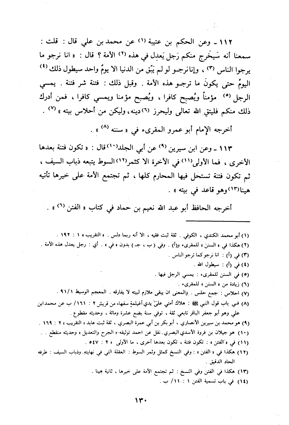 قال: إنا نرجو ما يرجو الناس، وإنا نرجو لو لم يبق من الدنيا إلا يوم واحد سيطول ذلك اليوم حتى يكون ما ترجو هذه الأمة، وقبل ذلك فتنة شر فتنة، يمسي الرجل مؤمناً ويصبح كافراً، ويصبح مؤمناً ويمسي كافراً، فمن أدرك ذلك منكم فليتق الله تعالى، ولكن من أحلاس بيته.