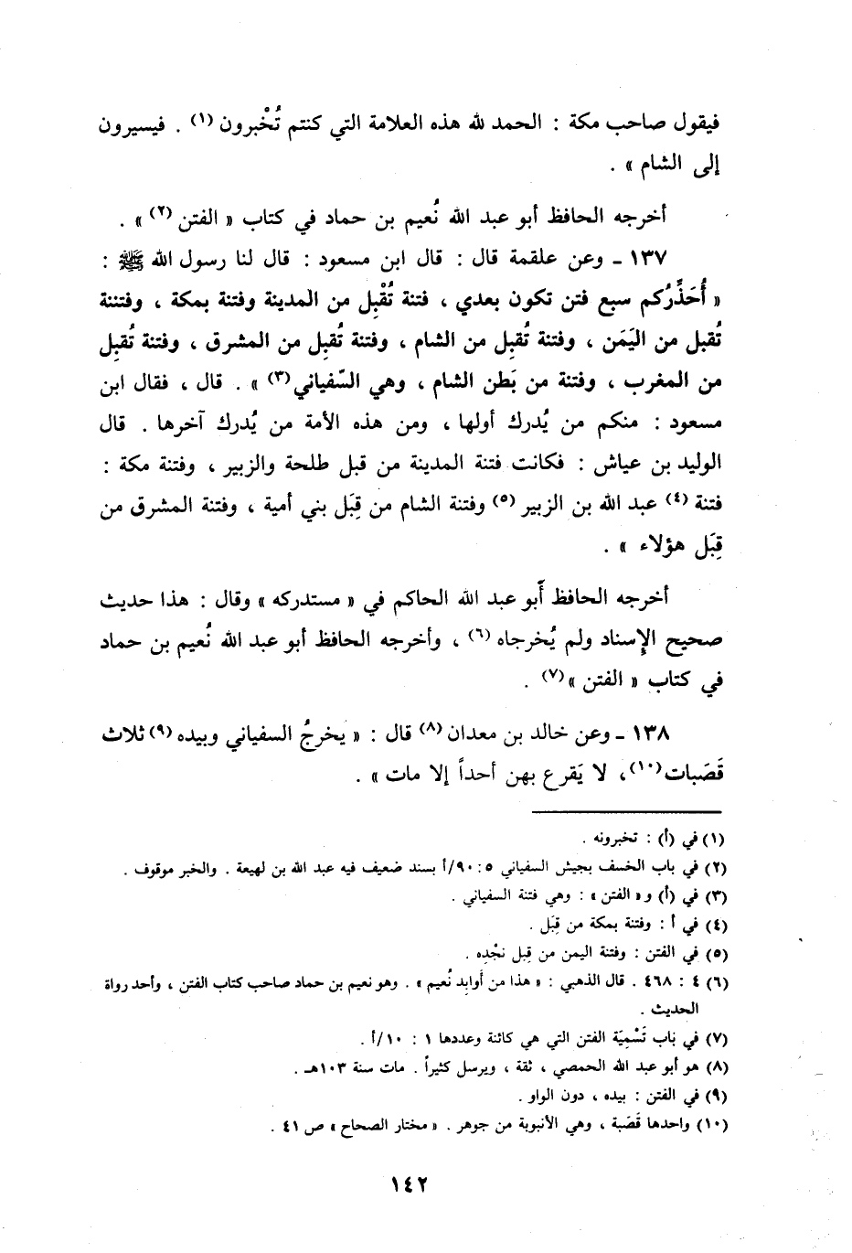 وعن علقمة، قال: قال ابن مسعود: قال لنا رسول الله صلى الله عليه وسلم: " أحذركم سبع فتن تكون بعدي؛ فتنة تقبل من المدينة، وفتنة بمكة، وفتنة تقبل من اليمن، وفتنة تقبل من الشام، وفتنة تقبل من المشرق، وفتنة تقبل من المغرب، وفتنة من بطن الشام، وهي السفياني ".