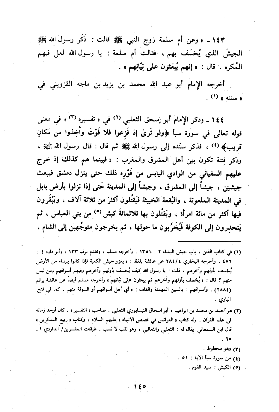 وذكر الإمام أبو إسحاق الثعلبي في تفسيره في معنى قوله عز وجل في سورة سبأ: " ولو ترى إذ فزعوا فلا فوت وأخذوا من مكان قريب " فذكر سنده إلى رسول الله صلى الله عليه وسلم، ثم قال: قال رسول الله صلى الله عليه وسلم وذكر فتنة تكون بين أهل المشرق والمغرب: فبينما هم كذلك إذ خرج عليهم السفياني، من الوادي اليابس في فوره ذلك حتى ينزل دمشق، فيبعث جيشين؛ جيشاً إلى المشرق، وجيشاً إلى المدينة، حتى إذا نزلوا بأرض بابل، في المدينة الملعونة، والبقعة الخبيثة، فيقتلون أكثر من ثلاثة آلاف، ويبقرون بها أكثر من مائة امرأة، ويقتلون بها ثلاثمائة كبش من بني العباس.