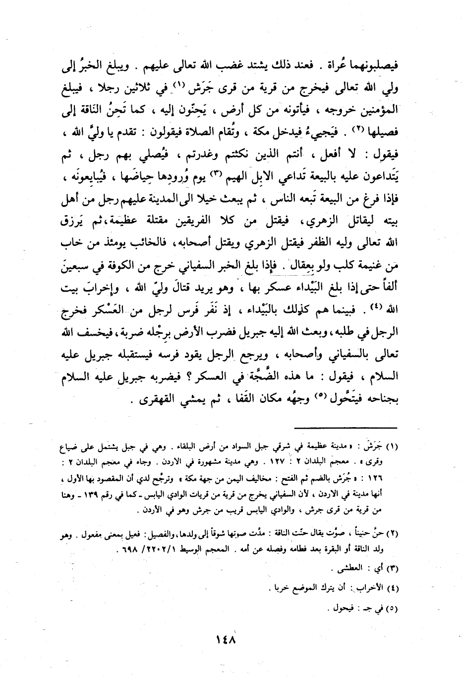 ويرجع الرجل يقود فرسه، فيستقبله جبريل عليه السلام فيقول: ما هذه الضجة في العسكر؟ فيضربه جبريل عليه السلام بجناحه، فيحول وجهه مكان القفا، ثم يمشي القهقرى.