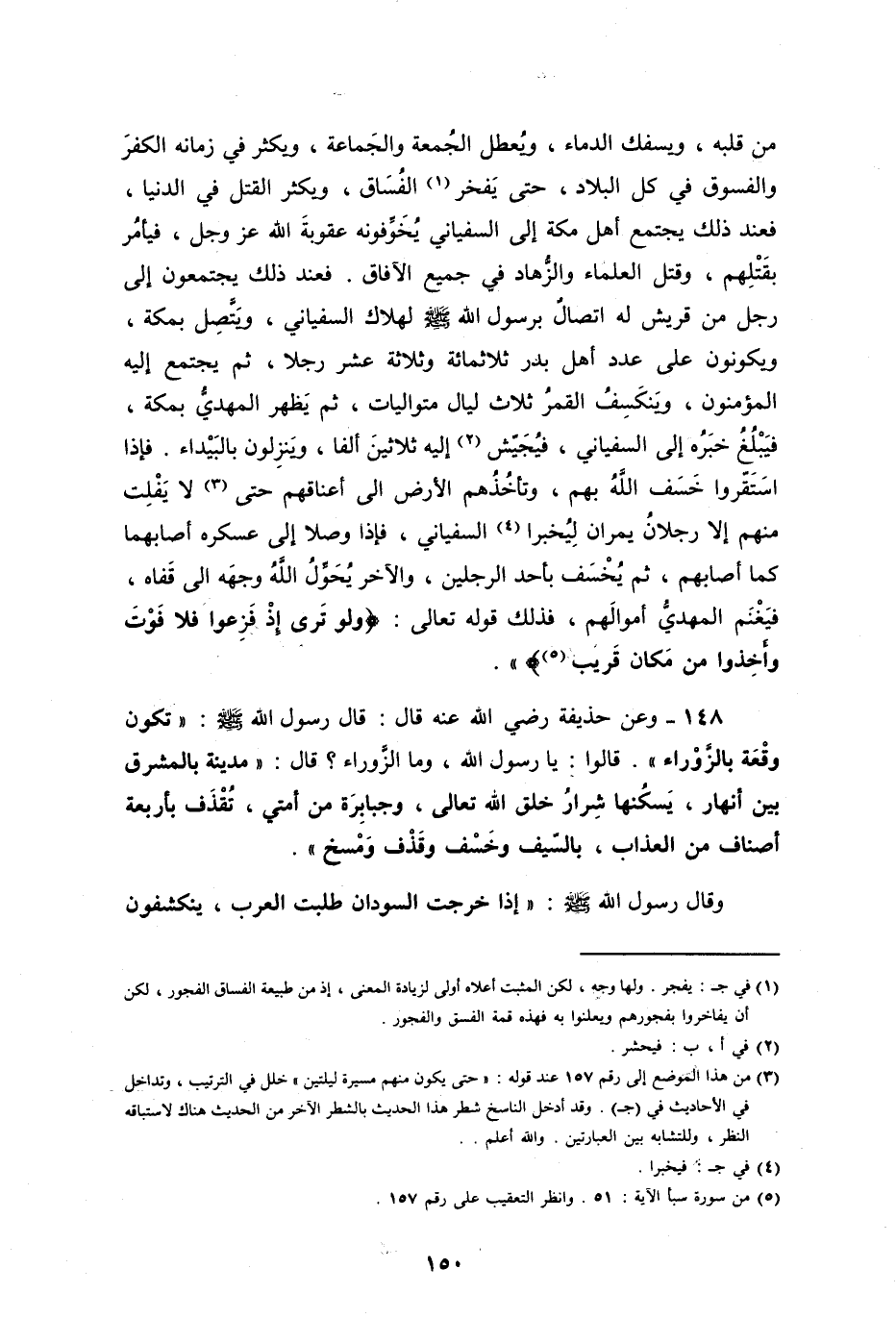 فعند ذلك يجتمعون إلى رجل من قريش، له اتصال برسول الله صلى الله عليه وسلم، لهلاك السفياني ويتصل بمكة، ويكونون على عدد أهل بدر، ثلاثمائة وثلاثة عشر رجلاً، ثم تجتمع إليه المؤمنون، عدد أهل بدر، ثلاثمائة وثلاثة عشر رجلاً، ثم تجتمع إليه المؤمنون، وينكسف القمر ثلاث ليالي متواليات.
