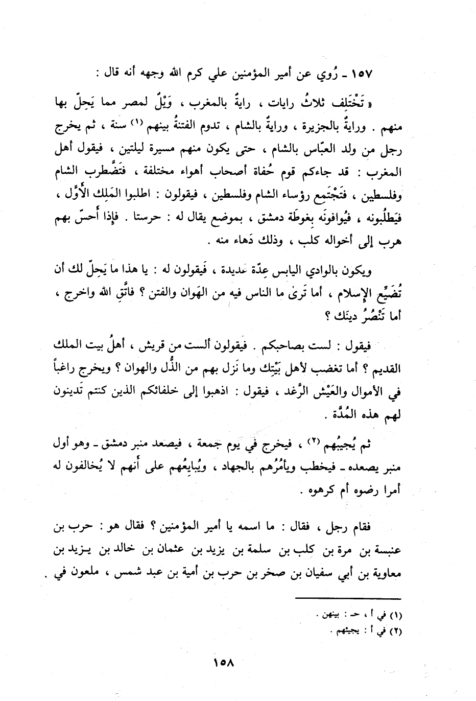 عن أمير المؤمنين علي بن أبي طالب عليه السلام، قال: تختلف ثلاث رايات؛ راية بالمغرب، ويل لمصر وما يحل بها منهم، وراية بالجزيرة وراية بالشام، تدوم الفتنة بينهم سنة.