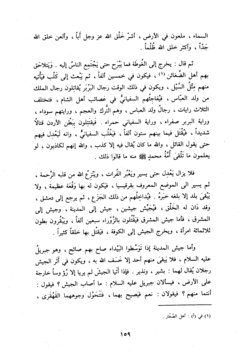 ثم يرجع دمشق، وقد دان له الخلق، فيجيش جيشين؛ جيش إلى المدينة، وجيش إلى المشرق، فأما جيش المشرق فيقتلون بالزوراء سبعين ألفاً، ويبقرون بطون ثلاثمائة امرأة، ويخرج الجيش إلى الكوفة، فيقتل بها خلقاً.