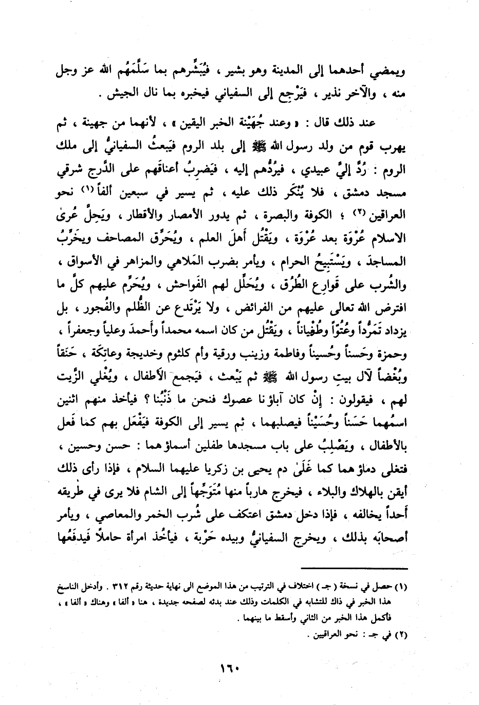 ثم يهرب قوم من ولد رسول الله صلى الله عليه وسلم إلى بلد الروم، فيبعث السفياني إلى ملك الروم: رد إلي عبيدي. فيردهم إليه، فيضرب أعناقهم على الدرج، شرقي مسجد دمشق فلا ينكر ذلك عليه.