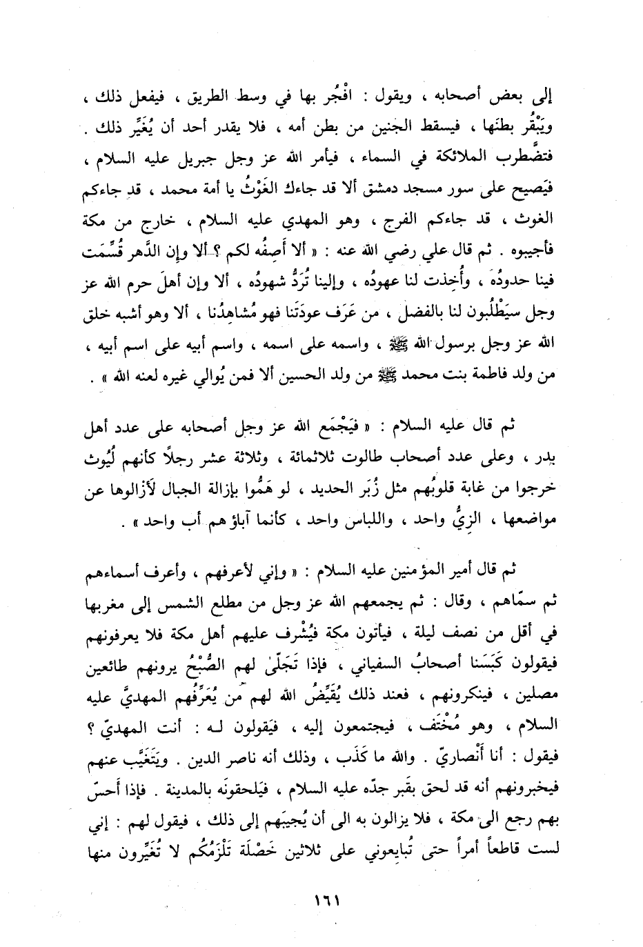 ثم قال عليه السلام: فيجمع الله عز وجل أصحابه على عدد أهل بدر، وعلى عدد أصحاب طالوت، ثلاثمائة وثلاثة عشر رجلاً، كأنهم ليوث خرجوا من غابة، قلوبهم مثل زبر الحديد، لوهموا بإزالة الجبال لأزالوها عن موضعها، الزي واحد، واللباس واحد، كأنما آباؤهم أب واحد.