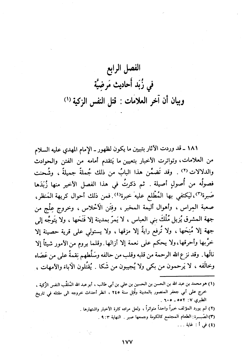 الفصل الرابع في زبد أحاديث مرضية وبيان أن آخر العلامات قتل النفس الزكية