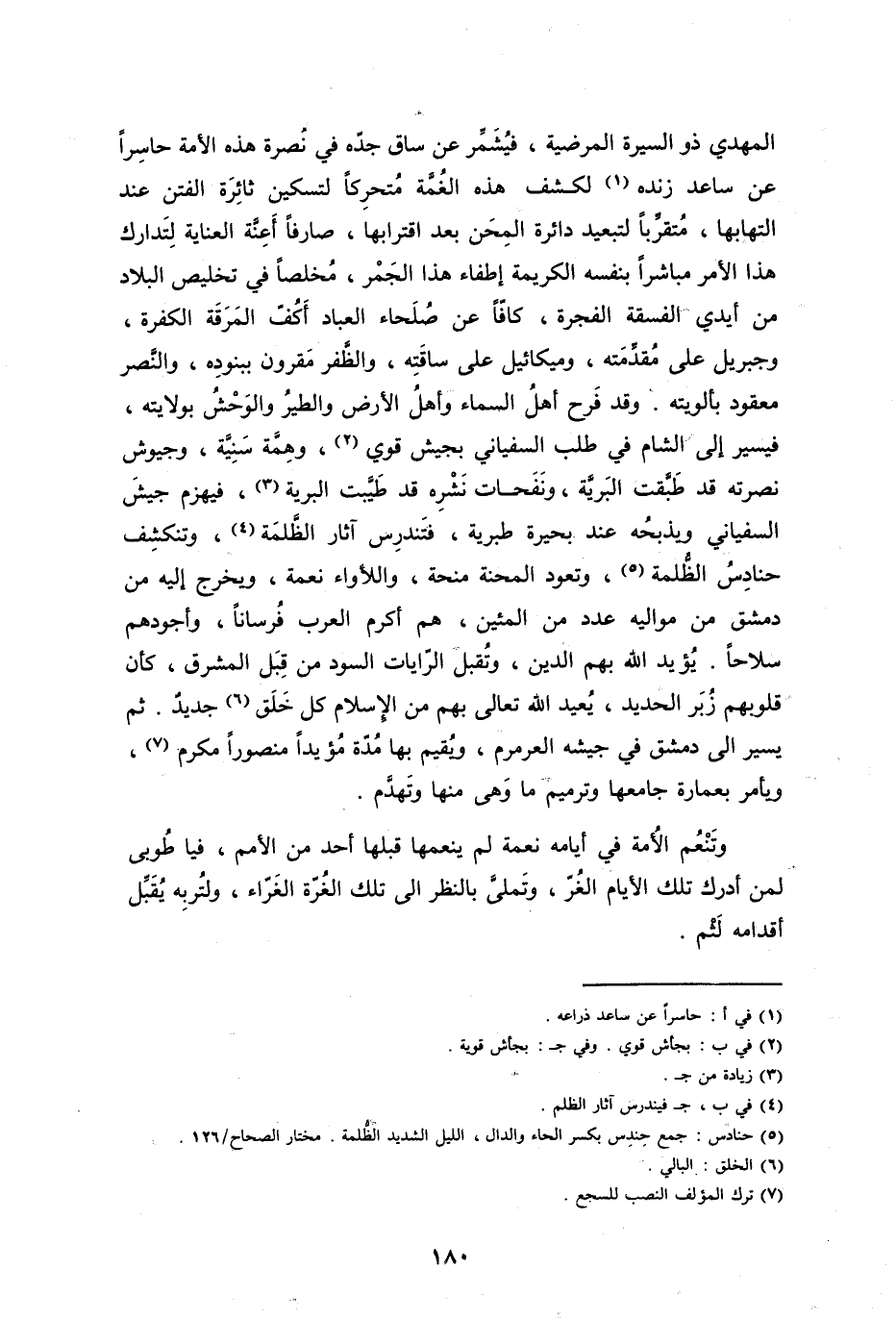 المهدي ذو السيرة المرضية، فيشمر عن سق جده في نضرة هذه الأمة، حاسراً عن ساعد زنده لكشف هذه الغمة، متحركاً لتسكين ثائرة الفتن عند التهابها، متقرباً لتبعيد دائرة المحن بعد اقترابها، صارفاً أعنة العناية لتدارك هذا الأمر، مباشراً بنفسه الكريمة إطفاء هذا الجمر، مخلصاً في تخليص البلاد من أيدي الفسقة الفجرة، كافاً عن صلحاء العباد أكف المقرة الكفرة، وجبريل على مقدمته، وميكائيل على ساقته، والظفر مقرون ببنوده، والنصر معقود بألويته، وقد فرح أهل السماء وأهل الأرض والطير والوحش بولايته: