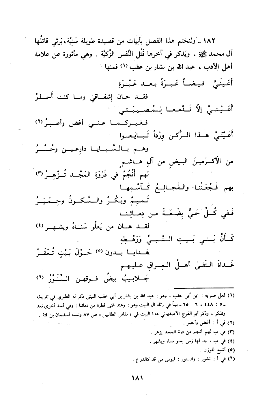 ولنختم هذا الفصل بأبيات من قصيدة طويلة سنية، يرثي قاتلها فيها آل محمد ويذكر في آخرها قتل النفس الزكية، وهي مأثورة عن علامة الأدب عبد الله بن بشار بن عقب، فمنها: