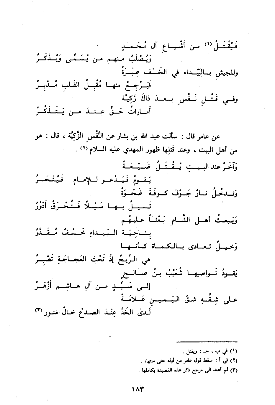 عن عامر، قال: سألت عبد الله بن بشار، عن النفس الزكية، قال: هو من أهل البيت، وعند قتلها ظهور المهدي عليه السلام.