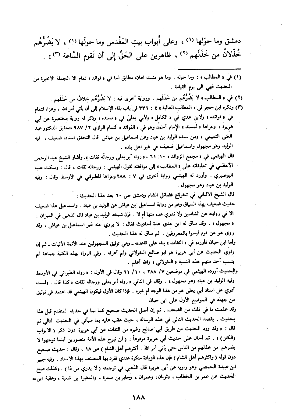 دمشق وما حولها، وعلى أبواب بيت المقدس وما حولها، لا يضرهم خذلان من خذلهم، ظاهرين على الحق إلى أن تقوم الساعة ".