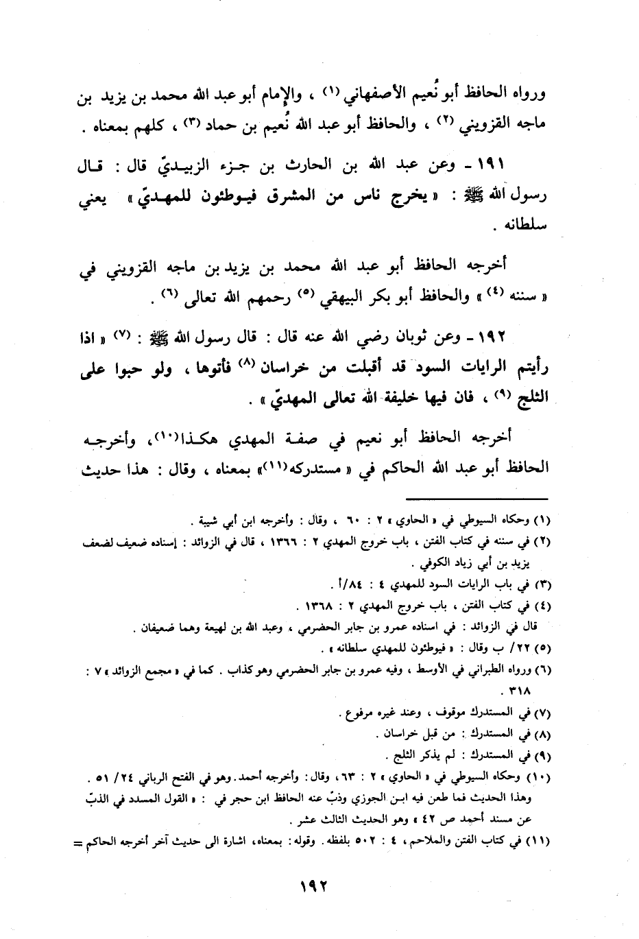 وعن ثوبان، رضي الله عنه، قال: قال رسول الله صلى الله عليه وسلم: " إذا رأيتم الرايات السود قد أقبلت من خراسان، فأتوها ولو حبوا على الثلج؛ فإن فيها خليفة الله المهدي ".