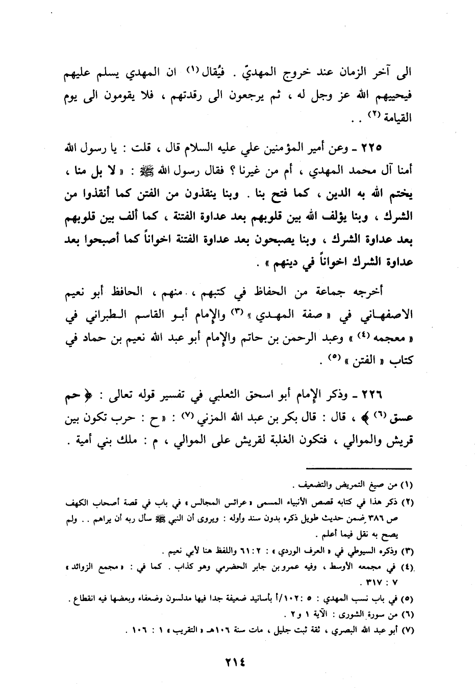 وعن أمير المؤمنين اعلي بن أبي طالب عليه السلام، قال: قلت يا رسول الله، أمنا آل محمد المهدي، أو من غيرنا؟ فقال رسول الله صلى الله عليه وسلم: " بل منا، يختم الله به الدين، كما فتحه بنا، وبنا ينقذون من الفتن، كما أنقذوا من الشرك، وبنا يؤلف الله بين قلوبهم بعد عداوة الفتنة إخواناً، كما ألف بين قلوبهم بعد عداوة الشرك، وبنا يصبحون بعد عداوة الفتنة إخواناً، كما أصبحوا بعد عداوة الشرك إخواناً في دينهم ".