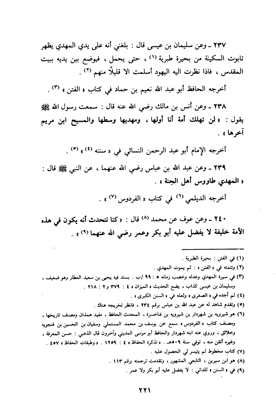 وعن سليمان بن عيسى، قال: بلغني أنه على يدي المهدي يظهر تابوت السكينة من بحيرة طبرية، حتى يحمل، فيوضع ببين يديه ببيت المقدس، فإذا نظرت إليه اليهود أسلمت إلا قليلاً منهم.