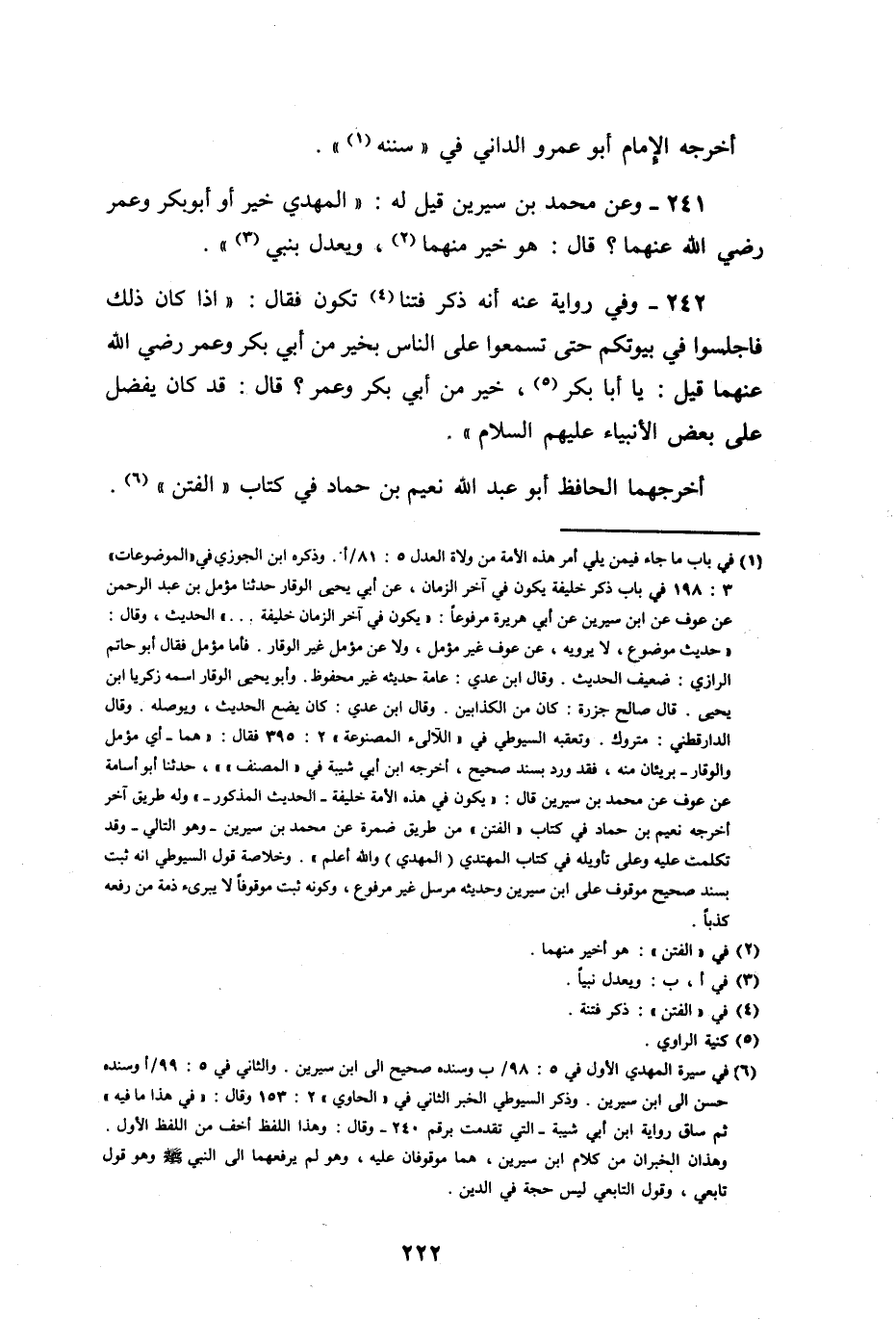 وعن محمد بن سيرين، قيل له: المهدي خير، أو أبو بكر وعمر؟ قال: هو خير منهما، ويعدل نبياً.
